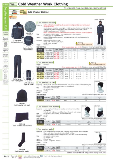 THENUMBERNEXTTOTHELOGOMARKINDICATESITEMSINSTOCKFOREACHBRAND.TATB-BK(COLDWEATHERKNITCAP)EXAMPLEEXAMPLEEXAMPLETATN-BK(COLDWEATHERNECKWARMER)TATK-BK(COLDWEATHERSOCKS)EXAMPLEUSAGEEXAMPLE(WITHREFLECTIVETAPEONBACK)TATBP-M-BK(COLDWEATHERPANTS)TATBB-M-BK(COLDWEATHERBLOUSON)(WITHREFLECTIVETAPEONBACK)WITHBELTFORARMBANDTRUSCOCOLDWEATHERCLOTHINGORDERCODEITEMNO.PRICE(PERPAIR)MSRP(PERPAIR)COLORSIZE(CM)SPQ(PAIR)WEIGHT(G)489-4171TATK-BK¥729¥900BLACK25TO2750120CONTACTUS:0120-509-849HTTP://WWW.ORANGE-BOOK.COM/ORDERCODEITEMNO.PRICE(PERPIECE)MSRP(PERPIECE)COLORSIZESPQ(PIECE)WEIGHT(G)489-4189TATN-BK¥608¥750BLACK/GRAYFREE10070ORDERCODEITEMNO.PRICE(PERPIECE)MSRP(PERPIECE)COLORSIZESPQ(PIECE)WEIGHT(G)489-4162TATB-BK¥518¥640BLACKFREE10070ORDERCODEITEMNO.PRICE(PERPIECE)MSRP(PERPIECE)COLORSIZEWAIST(CM)INSEAM(CM)SPQ(PIECE)WEIGHT(G)487-8051TATBP-M-BK¥10,287¥12,700BLACKM68TO88771420487-8035TATBP-L-BK¥10,287¥12,700BLACKL76TO96771450487-8043TATBP-LL-BK¥10,287¥12,700BLACKLL84TO104771480487-8027TATBP-3L-BK¥10,287¥12,700BLACK3L94TO114771520ORDERCODEITEMNO.PRICE(PERPIECE)MSRP(PERPIECE)COLORSIZELENGTH(CM)CHESTCIRCUMFERENCE(CM)SPQ(PIECE)WEIGHT(G)487-8019TATBB-M-BK¥11,259¥13,900BLACKM761191650487-7993TATBB-L-BK¥11,259¥13,900BLACKL781251700487-8001TATBB-LL-BK¥11,259¥13,900BLACKLL801311740487-7985TATBB-3L-BK¥11,259¥13,900BLACK3L821371790STOCK38,650ITEMSORDERUNIT:1PIECE(PRICEREVISIONDATE:JAN,2017)TRUSCONAKAYAMACORPORATIONORDERUNIT:1PIECE(PRICEREVISIONDATE:JAN,2017)TRUSCONAKAYAMACORPORATIONORDERUNIT:1PIECETRUSCONAKAYAMACORPORATIONORDERUNIT:1PIECETRUSCONAKAYAMACORPORATIONORDERUNIT:1PAIRTRUSCONAKAYAMACORPORATIONDRAWING.COMFEATURES●LIGHTWEIGHTCOTTONWADDINGWITHEXCELLENTHEATGENERATIONANDTEMPERATUREINSULATIONISUSED.●COREBRIDUSEDASCOTTONWADDINGISAHIGHLYFUNCTIONALCOTTONWADDINGTHATISACOMBINATIONOFACRYLICFIBERMIXEDWITHCONDUCTIVEPARTICLES(MITSUBISHIRAYON)ANDSHRAPE-ECO(TOYOBO).●EN471SUPPORTINGPRODUCTWITHAREFLECTIVETAPEWHICHENHANCESVISUALRECOGNITION.USE●FORWORKINCOLDCLIMATES.●FOROUTDOORWORKDURINGWINTER.●CANBEWORNFORNIGHT-TIMEWORK.SPECS●ADOPTS3000MMWATERPRESSURERESISTANTMATERIALWITHWINDPROTECTIONFOROUTERMATERIALMATERIALS●OUTERMATERIAL:100%NYLON●FILLING:97%POLYESTER,3%ACRYLIC●LINING:100%POLYESTERORIGIN●VIETNAMCOLDWEATHERBLOUSONORIGIN●VIETNAMCOLDWEATHERPANTSFEATURES●MADEOFSOFTANDCOMFORTABLEMATERIAL,ANDCANBEUSEDASCOLDWEATHERGEAR.●ITEMTHATISSOFTANDISEASYTOPUTONANDTAKEOFF.USE●FORWORKINCOLDCLIMATES.●TOPREVENTCOLD.MATERIALS●ACRYLICORIGIN●CHINACOLDWEATHERKNITCAPFEATURES●ATWO-WAYTYPETHATCANBEUSEDASANECKWARMERANDANEARWARMER.●PROTECTSNECKANDEARSFROMCHILLYWINDANDSNOWINCOLDSEASON.USE●FORWORKINCOLDCLIMATES.●TOPREVENTCOLD.MATERIALS●ACRYLICORIGIN●CHINACOLDWEATHERNECKWARMERFEATURES●COLDWEATHERSOCKSTREATEDWITHCAPSAICIN,ACOMPONENTOFCHILIPEPPERS.●WARMWITHRAISEDBACKTREATMENTANDPILEKNITTING.●THESOCKSHAVEALOOSEOPENINGFOREASYWEARANDMODERATETIGHTENING.USE●FORWORKINCOLDCLIMATES.●TOPREVENTCOLD.SPECS●MID-CALFTYPEMATERIALS●ACRYLIC●POLYESTER●WOOLORIGIN●CHINACOLDWEATHERSOCKS●NOTCOMPLETELYWATERPROOF.WARNING●NOTCOMPLETELYWATERPROOF.WARNINGSUPPLIESAGAINSTCOLDWINTERCLOTHESPOCKETWARMERSTHAWAGENTS,MELTINGSNOWAGENTSANTIFREEZINGAGENTSSNOWPLOWS,SPREADERSSHOVELSFORCLEANINGSNOWSNOWDUMPSSNOWREMOVINGBRUSHES,WIPERSSNOWSLIDINGSHEETS,SLIPPERMATSINSULATION/DEWCONDENSATIONPREVENTIONFILMSFORWINDOWSTOCK458ITEMSCOLDWEATHERWORKCLOTHING9-812*0522530*9-812ORDERCODEYELLOW…INSTANTDELIVERY(JAPANONLY)BLUE…BACKORDER(CARRIAGEEXCLUDED)ITEMNO.PINK…STOCKININDONESIA/THAILAND