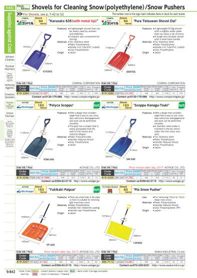 THENUMBERNEXTTOTHELOGOMARKINDICATESITEMSINSTOCKFOREACHBRAND.1640MM387MM420MMYP-420348MM400MM0097051180MM010343280MM345MM970MM1245001370MM495MM288MM1125MM339MM412MMPSM-3401115MM340MM410MMSM-340FORSHOVELS,SEEP.7-42TO52ASTAGE"YUKIKAKIPAIPUE"STOCK153ITEMSORDERUNIT:1PIECE(PRICEREVISIONDATE:SEP,2017)ASTAGECO.,LTD.ORDERCODEITEMNO.PRICE(PERPIECE)MSRP(PERPIECE)BLADEEDGEWIDTH(MM)BLADEEDGELENGTH(MM)TOTALLENGTH(MM)SPQ(PIECE)WEIGHT(KG)819-3257YP-420¥1,162-4203871640300.8CONTACTUS:0256-62-3115HTTP://WWW.ASTAGE.JP/COMPAL“KARUSUKO635(WITHMETALTIP)”STOCK94ITEMSORDERCODEITEMNO.PRICE(PERPIECE)MSRP(PERPIECE)BLADEEDGEWIDTH(MM)BLADEEDGELENGTH(MM)TOTALLENGTH(MM)SPQ(PIECE)WEIGHT(G)819-3284010343¥1,527-28034597012640CONTACTUS:0120-175-086HTTP://WWW.COMPAL-NIIGATA.JP/ORDERUNIT:1PIECECOMPALCORPORATIONASTAGE"POLYCASCOPPU"ORDERCODEITEMNO.PRICE(PERPIECE)MSRP(PERPIECE)BLADEEDGEWIDTH(MM)BLADEEDGELENGTH(MM)TOTALLENGTH(MM)SPQ(PIECE)WEIGHT(KG)819-3256PSM-340¥1,944-3394121125201.0CONTACTUS:0256-62-3115HTTP://WWW.ASTAGE.JP/STOCK153ITEMSORDERUNIT:1PIECEASTAGECO.,LTD.FEATURES●THEREARESMALLHOLESINTHEPLATESOTHATITISSUITABLEFORREMOVINGLIGHTSNOW(NEWSNOW).MATERIALS●PLATE:POLYETHYLENE●HANDLE:IRON(MELAMINECOATING)●HANDLECAP:POLYETHYLENEORIGIN●JAPANFEATURES●ALIGHTWEIGHTSHOVELTHATCANBEEASILYUSEDBYWOMENANDELDERLIES.●COMPACTSIZECONVENIENTFORSTORING.MATERIALS●TIP:STAINLESSSTEEL●PLATE:POLYETHYLENE●HANDLE:IRONTUBE(PVCCOATED)●GRIP:POLYETHYLENEORIGIN●JAPANFEATURES●WITHADESIGNTHATCONSIDERSANGLETHATISEASYTOUSE,SNOWSLIPSWELL(SNOWDISENGAGEMENT)ANDWORKCANBEPERFORMEDSMOOTHLY.●THEGRIPHASASHAPETHATISEASILYGRASPABLETHATFITSWELLTOTHEHANDSANDREDUCESFATIGUE.MATERIALS●PLATE:POLYCARBONATE●HANDLE:NATURALWOOD●GRIP:POLYETHYLENEORIGIN●JAPANCOMPAL"PURATETSUWANSHOVELDAI"STOCK94ITEMSORDERCODEITEMNO.PRICE(PERPIECE)MSRP(PERPIECE)BLADEEDGEWIDTH(MM)BLADEEDGELENGTH(MM)TOTALLENGTH(MM)SPQ(PIECE)WEIGHT(G)819-3285009705¥1,743-348400118012910CONTACTUS:0120-175-086HTTP://WWW.COMPAL-NIIGATA.JP/THEGOLDENELEPHANT"PLASNOWPUSHER"STOCK83ITEMSORDERCODEITEMNO.PRICE(PERPIECE)MSRP(PERPIECE)BLADEEDGEWIDTH(MM)BLADEEDGELENGTH(MM)TOTALLENGTH(MM)SPQ(PIECE)WEIGHT(KG)495-7113124500¥2,401-4952881370201.8CONTACTUS:072-229-5221HTTP://WWW.ASAKA-IND.CO.JP/ORDERUNIT:1PIECEASAKAINDUSTRIALCO.LTD.ORDERUNIT:1PIECECOMPALCORPORATIONORDERCODEITEMNO.PRICE(PERPIECE)MSRP(PERPIECE)BLADEEDGEWIDTH(MM)BLADEEDGELENGTH(MM)TOTALLENGTH(MM)SPQ(PIECE)WEIGHT(KG)819-3255SM-340¥1,702-3404101115201.1CONTACTUS:0256-62-3115HTTP://WWW.ASTAGE.JP/ORDERUNIT:1PIECE(PRICEREVISIONDATE:SEP,2017)ASTAGECO.,LTD.ASTAGE"SCOPPUKANAGU-TSUKI"STOCK153ITEMSFEATURES●ALIGHWEIGHT(910G)SHOVELWITHASLIGHTLYWIDERPLATETHATCANPLOWALOTOFSNOW.●ATOUGHANDDURABLESHOVELWITHASTEELTUBEHANDLE.MATERIALS●TIP:STAINLESSSTEEL●PLATE:POLYETHYLENE●HANDLE:IRONTUBE(PVCCOATED)●GRIP:POLYETHYLENEORIGIN●JAPANUSE●FORREMOVING10CMTO15CMDEEPNEWSNOW.MATERIALS●PLATE:POLYPROPYLENE●HANDLE:NATURALWOOD●GRIP:POLYPROPYLENE(PP)ORIGIN●JAPANFEATURES●WITHADESIGNTHATCONSIDERSANGLETHATISEASYTOUSE,SNOWSLIPSWELL(SNOWDISENGAGEMENT)ANDWORKCANBEPERFORMEDSMOOTHLY.●ASTAINLESSSTEELPLATEISINSERTEDINTHETIPWHICHSTABSINTOTHESNOWVERYWELL.MATERIALS●TIP:STAINLESSSTEEL●PLATE:POLYETHYLENE●HANDLE:NATURALWOOD●GRIP:POLYETHYLENEORIGIN●JAPANSUPPLIESAGAINSTCOLDWINTERCLOTHESPOCKETWARMERSTHAWAGENTS,MELTINGSNOWAGENTSANTIFREEZINGAGENTSSNOWPLOWS,SPREADERSSHOVELSFORCLEANINGSNOWSNOWDUMPSSNOWREMOVINGBRUSHES,WIPERSSNOWSLIDINGSHEETS,SLIPPERMATSINSULATION/DEWCONDENSATIONPREVENTIONFILMSFORWINDOWSTOCK52ITEMSSHOVELSFORCLEANINGSNOW(POLYETHYLENE)/SNOWPUSHERS9-842*C092011*9-842ORDERCODEYELLOW…INSTANTDELIVERY(JAPANONLY)BLUE…BACKORDER(CARRIAGEEXCLUDED)ITEMNO.PINK…STOCKININDONESIA/THAILAND