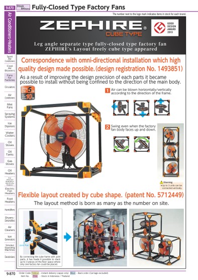 THENUMBERNEXTTOTHELOGOMARKINDICATESITEMSINSTOCKFOREACHBRAND.CORRESPONDENCEWITHOMNI-DIRECTIONALINSTALLATIONWHICHHIGHQUALITYDESIGNMADEPOSSIBLE.(DESIGNREGISTRATIONNO.1493851)ASARESULTOFIMPROVINGTHEDESIGNPRECISIONOFEACHPARTSITBECAMEPOSSIBLETOINSTALLWITHOUTBEINGCONFINEDTOTHEDIRECTIONOFTHEMAINBODY.FLEXIBLELAYOUTCREATEDBYCUBESHAPE.(PATENTNO.5712449)THELAYOUTMETHODISBORNASMANYASTHENUMBERONSITE.AIRCANBEBLOWNHORIZONTALLY/VERTICALLYACCORDINGTOTHEDIRECTIONOFTHEFRAME.1SWINGEVENWHENTHEFACTORYFANBODYFACESUPANDDOWN.2BYCONNECTINGTHECUBEFRAMEWITHJOINTPARTS,ITHASMADEITPOSSIBLETOSTACKUPTO3PIECESONTHEFLOORSPACEWHEREONLYONEFACTORYFANCOULDBEPLACED.JOINTPARTWARRANTYPERIODDESIGNSTANDARDUSEPERIODYEARSYEARSLEGANGLESEPARATETYPEFULLY-CLOSEDTYPEFACTORYFANZEPHIRE'SLAYOUTFREELYCUBETYPEAPPEARED●UPTO3UNITSCANBECONNECTEDVERTICALLY.WARNINGAIRCONDITIONERS・HEATERSSPOTAIRCONDITIONERSCOOLAIRBLOWERSFANSFORFACTORIESCIRCULATORSAIRCONDITIONERSMISTFANSSPRAYINGSYSTEMSICEDISPENSERSWATERCOOLERSOILSTOVESOILTANKSGASSTOVESOILHEATERSFARINFRAREDRADIATIONELECTRICITYHEATERSELECTRICFANHEATERSFOOTHEATERSHUMIDIFIERSDRYERS・DEHUMIDIFIERSAIRCLEANERSIONGENERATORSSMOKESEPARATINGMACHINESDEODORIZERSSTOCK84ITEMSFULLY-CLOSEDTYPEFACTORYFANS9-870*0521480*9-870ORDERCODEYELLOW…INSTANTDELIVERY(JAPANONLY)BLUE…BACKORDER(CARRIAGEEXCLUDED)ITEMNO.PINK…STOCKININDONESIA/THAILAND