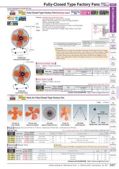 PRICESDISPLAYEDINCLUDE8%TAX.TFP-45-10(RESINBLADE)TFP-45-10A(ALUMINUMBLADE)TFP-45G(GUARDFORBLADE(FRONT/REAR))TF-45-10(RESINBLADE)TFR-3PBS(STANDLEGSET)TFR-BS(STANDBASEONLY)TFR-CP(NECKCENTERPIPE)TFR-1P(LEGPIPEONLY)ITEMNO.REPLACEMENTBLADETFZRA-45ATFP-45-10A(ALUMINUM)TFZR-45ATF-45-10(ASRESIN)STANDARDELECTRICCONSUMPTIONRATE3.1YEN/H(50HZ)/4.3YEN/H(60HZ)APPROX.90°HORIZONTVERTICALPITCHAPPROX.40°APPROX.5°HEADSWINGALLOWANCEANGLETFZR-45A(RESINBLADETYPE)RESINBLADE511MM350MMTFZRA-45A(ALUMINUMBLADETYPE)630MMALUMINUMBLADETRUSCOFULLY-CLOSEDTYPEFACTORYFAN(DESKTOPTYPE)REPAIRINGOKTRUSCOPARTSFORFULLY-CLOSEDTYPEFACTORYFANORDERCODEITEMNO.PRICE(PERPIECE)MSRP(PERPIECE)ITEMNAMECOMPATIBLEMODELSPQ(PIECE)WEIGHT(KG)762-4891TFR-3PBS¥5,022¥6,200STANDLEGSETTFZRSERIES,TFZSERIES(MAINUNITDISCONTINUED)11.6762-4905TFR-BS¥3,240¥4,000STANDBASEONLYTFZRSERIES500.4762-4883TFR-1P¥1,013¥1,250LEGPIPEONLY(1PIPE)TFZRSERIES300.4762-4913TFR-CP¥1,256¥1,550NECKCENTERPIPETFZRSERIES500.3CONTACTUS:0120-509-849HTTP://WWW.ORANGE-BOOK.COM/ORDERCODEITEMNO.PRICE(PERPIECE)MSRP(PERPIECE)ITEMNAMEDIAMETER(MM)HOLEDIAMETER(MM)COMPATIBLEMODELSPQ(PIECE)WEIGHT(KG)424-9976TFP-45-10¥3,451¥4,260RESINBLADE45010TFZPSERIES10.75424-9984TFP-45-10A¥4,487¥5,540ALUMINUMBLADE44010TFZPSERIES,TFZRSERIES,TFZSERIES(MAINUNITDISCONTINUED)10.45424-9992TFP-45G¥4,747¥5,860GUARDFORBLADES(FRONT/REAR)510-TFZPSERIES,TFZRSERIES11.50233-3180TF-45-10¥3,103¥3,830RESINBLADE45010TFZRSERIES,TFZSERIES(MAINUNITDISCONTINUED)10.55ORDERCODEITEMNO.PRICE(PERPIECE)MSRP(PERPIECE)POWER(V)ELECTRICITYCONSUMPTION(W)(50/60HZ)BLADEDIAMETER(CM)WEIGHT(KG)453-8820TFZR-45A¥18,630¥23,000SINGLEPHASE100116/159457.0CONTACTUS:0120-509-849HTTP://WWW.ORANGE-BOOK.COM/ORDERCODEITEMNO.PRICE(PERPIECE)MSRP(PERPIECE)POWER(V)ELECTRICITYCONSUMPTION(W)(50/60HZ)BLADEDIAMETER(CM)WEIGHT(KG)474-8981TFZRA-45A¥18,630¥23,000SINGLEPHASE100116/159447.0STOCK38,650ITEMSSTOCK38,650ITEMSORDERUNIT:1PIECE(PRICEREVISIONDATE:FEB,2015)TRUSCONAKAYAMACORPORATIONORDERUNIT:1PIECE(PRICEREVISIONDATE:FEB,2015)ORDERUNIT:1PIECE(PRICEREVISIONDATE:FEB,2015)TRUSCONAKAYAMACORPORATIONORDERUNIT:1PIECEDRAWING.COMFEATURES●ADOPTSFULLYCLOSEDTYPEMOTOR.●CARRYINGHANDLEISCONVENIENTFORCARRYING.●BUILT-INTHERMALPROTECTORFORMOTORBURNINGPREVENTION.●SPACESAVING/HIGHQUALITY.USE●TOAERATIONOFTHEFACTORYANDWORKSITE.●COMPACTTYPETHATCANBEPLACEDONADESKORWORKINGTABLE.SPECS●POWERCORD:2M(WITHGROUNDING)●AIRVOLUMEADJUSTMENT:3STAGES(HIGH,MEDIUM,LOW)TYPEORIGIN●TAIWANSPECS●BLADE:4SHEETS(ALUMINUM)ALUMINUMBLADETYPESPECS●BLADES:4SHEETS(ASRESIN)RESINBLADETYPEORIGIN●TAIWANMATERIALS●ASRESIN(TFP-45-10,TF-45-10)●ALUMINUM(TFP-45-10A)●SOFTSTEELWIRE(TFP-45G)BLADEMATERIALS●STEELSTANDLEG●"WARRANTYPERIOD"IS3YEARSFROMTHEDATEOFPURCHASE.WEWILLREPAIRFORFREEOFCHARGEWITHIN3YEARSFROMTHEDATEOFPURCHASEINCASEOFFAILUREINNORMALUSESITUATION."DESIGNSTANDARDUSEPERIOD"ISTHEPERIODFROMTHEPOINTOFMANUFACTURE,NOTTHEPERIODFROMPURCHASE.PLEASEALSOBEWARNINGAWARETHATITDOESNOTASSUMETHEOBLIGATIONOFFREEREPAIRORFREEREPLACEMENT.GUIDEONTHEDESIGNTOTHELAST,ITISNOTTHEWARRANTYPERIODOFTHEPRODUCT.WARNINGSTAGE3AIRFLOW90°QUALITYGUARAN-TEEDYEARS3YEARS6DESIGNSTA-NDARDUSEPERIOD●ONLYTHESTANDLEGSET(TFR-3PBS)ISCOMPATIBLEWITHTHETFZSERIES(MAINUNITDISCONTINUED).WARNINGAIRCONDITIONERS・HEATERSSPOTAIRCONDITIONERSCOOLAIRBLOWERSFANSFORFACTORIESCIRCULATORSAIRCONDITIONERSMISTFANSSPRAYINGSYSTEMSICEDISPENSERSWATERCOOLERSOILSTOVESOILTANKSGASSTOVESOILHEATERSFARINFRAREDRADIATIONELECTRICITYHEATERSELECTRICFANHEATERSFOOTHEATERSHUMIDIFIERSDRYERS・DEHUMIDIFIERSAIRCLEANERSIONGENERATORSSMOKESEPARATINGMACHINESDEODORIZERSFULLY-CLOSEDTYPEFACTORYFANSSTOCK84ITEMS9-877*0521430*9-877DELIVERYESTIMATE★…MANUFACTURERSTOCK★…DELIVERYWITHIN7WORKINGDAYS★…ASK