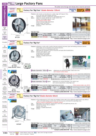 THENUMBERNEXTTOTHELOGOMARKINDICATESITEMSINSTOCKFOREACHBRAND.540MM1320MM1390MMBF125VEXAMPLEDCF60P360MM830MM805MMSWITCHUNITEXAMPLE370MM895MM1250MM1130MMBF-100V(BLADEDIAMETER100CM)BF-75V(BLADEDIAMETER75CM)350MM970MMANGLEADJUSTMENTEXAMPLESWITCHUNITCANBEMOVEDEASILYBYASINGLEPERSON.AIRVOLUMEADJUSTMENT:2-STEPNAKATOMIFACTORYFAN"BIGFAN"REPAIRINGOKSTOCK2ITEMSORDERUNIT:1PIECEFACTORYDIRECTNOFREIGHTCHARGEEXCLUDINGREMOTEISLANDS(PRICEREVISIONDATE:JAN,2015)ORDERCODEITEMNO.PRICE(PERPIECE)MSRP(PERPIECE)POWER(V)ELECTRICITYCONSUMPTION(W)(50/60HZ)BLADEDIAMETER(CM)STANDARDELECTRICCONSUMPTIONRATEWEIGHT(KG)★448-9411BF-75V¥36,450-SINGLEPHASE100257/346756.9YEN/H(50HZ)/9.3YEN/H(60HZ)28CONTACTUS:026-245-3105HTTP://WWW.NAKATOMI-SANGYO.COM/ORDERUNIT:1PIECEFACTORYDIRECTNOFREIGHTCHARGEEXCLUDINGREMOTEISLANDS(PRICEREVISIONDATE:JAN,2015)NAKATOMICORPORATIONORDERCODEITEMNO.PRICE(PERPIECE)MSRP(PERPIECE)POWER(V)ELECTRICITYCONSUMPTION(W)(50/60HZ)BLADEDIAMETER(CM)STANDARDELECTRICCONSUMPTIONRATEWEIGHT(KG)★448-9420BF-100V¥59,130-SINGLEPHASE100316/3841008.5YEN/H(50HZ)/10.4YEN/H(60HZ)38.5NAKATOMIFACTORYFAN"BIGFANS"(BLADEDIAMETER125CM)REPAIRINGOKHEAVYCAUTIONORDERCODEITEMNO.PRICE(PERPIECE)MSRP(PERPIECE)POWER(V)ELECTRICITYCONSUMPTION(W)(50/60HZ)BLADEDIAMETER(CM)STANDARDELECTRICCONSUMPTIONRATEWEIGHT(KG)495-8969BF125V¥91,260-SINGLEPHASE100555/82712515YEN/H(50HZ)/22.3YEN/H(60HZ)50CONTACTUS:026-245-3105HTTP://WWW.NAKATOMI-SANGYO.COM/STOCK2ITEMSORDERUNIT:1PIECENAKATOMICORPORATIONNAKATOMIFACTORYFAN"BIGFAN"(BLADEDIAMETER60CM)REPAIRINGOKORDERCODEITEMNO.PRICE(PERPIECE)MSRP(PERPIECE)POWER(V)ELECTRICITYCONSUMPTION(W)(50/60HZ)BLADEDIAMETER(CM)STANDARDELECTRICCONSUMPTIONRATEWEIGHT(KG)★495-8985DCF60P¥55,755-SINGLEPHASE100190605.1YEN/H(50HZ)/5.1YEN/H(60HZ)17CONTACTUS:026-245-3105HTTP://WWW.NAKATOMI-SANGYO.COM/STOCK2ITEMSORDERUNIT:1PIECEFACTORYDIRECTNOFREIGHTCHARGEEXCLUDINGREMOTEISLANDSNAKATOMICORPORATIONFEATURES●EMPLOYSAMOTORWITHABUILT-INTHERMALPROTECTOR(RECOVERYTYPEOVERHEATINGPROTECTIONDEVICE).●THEANGLECANBEADJUSTEDINTHEVERTICALDIRECTION.●EASYTOMOVEASITISEQUIPPEDWITHTIRES.USE●BLOWINGANDVENTILATIONWORKFORFACTORIESANDAGRICULTURALAPPLICATIONS.SPECS●POWERCORD:APPROX.2.4M●ADJUSTABLEVERTICALANGLE●FULLY-CLOSEDTYPEMOTOR●BLADES:3BLADES(ALUMINUM)ORIGIN●VIETNAMSPECS●MAXIMUMAIRVOLUME(50/60HZ):508/516M3/MIN●AIRVOLUMECONTROL:NONEBLADEDIAMETER100CMSPECS●MAXIMUMAIRVOLUME(50/60HZ):341/365M3/MIN●AIRVOLUMEADJUSTMENT:2-STEP(HIGH,LOW)BLADEDIAMETER75CMFEATURES●AIRVOLUMECANBEBLOWNTOAWIDERANGEWITHLARGEAIRFLOW.●YOUCANMOVEWITHHANDLESANDTIRES.USE●AERATIONOFFACTORY,WAREHOUSE,WORKSHOPSANDSOON.SPECS●MAXAIRVOLUME(50/60HZ):1158/1224M3/MIN●POWERCORDLENGTH:APPROX.2.4M●AIRVOLUMECONTROL:NONE●NONEVERTICALANGLEADJUSTMENT●FULLY-CLOSEDTYPEMOTOR●BLADE:4SHEETS(ALUMINUM)ORIGIN●VIETNAMFEATURES●THEEMPLOYMENTOFADCMOTORHASENABLEDCONTROLWITHALOWROTATIONALSPEEDWHICHWASDIFFICULTWITHANAC(ALTERNATINGCURRENT)MOTORANDTHISHASALSOMINIMIZEDTHEOPERATINGNOISE.●THEAIRVOLUMEISADJUSTABLEINASTEPLESSMANNER.USE●BLOWINGOFAIRINFACTORIES,WAREHOUSES,WORKSITES,ANDGATHERINGVENUES,ETC.SPECS●ROTATIONALSPEED:100TO1100MIN-1●POWERCORD:2.4M●BLADES:3BLADES(ALUMINUM)ORIGIN●CHINAAIRCONDITIONERS・HEATERSSPOTAIRCONDITIONERSCOOLAIRBLOWERSFANSFORFACTORIESCIRCULATORSAIRCONDITIONERSMISTFANSSPRAYINGSYSTEMSICEDISPENSERSWATERCOOLERSOILSTOVESOILTANKSGASSTOVESOILHEATERSFARINFRAREDRADIATIONELECTRICITYHEATERSELECTRICFANHEATERSFOOTHEATERSHUMIDIFIERSDRYERS・DEHUMIDIFIERSAIRCLEANERSIONGENERATORSSMOKESEPARATINGMACHINESDEODORIZERSSTOCK84ITEMSLARGEFACTORYFANS9-884*0521581*9-884ORDERCODEYELLOW…INSTANTDELIVERY(JAPANONLY)BLUE…BACKORDER(CARRIAGEEXCLUDED)ITEMNO.PINK…STOCKININDONESIA/THAILAND