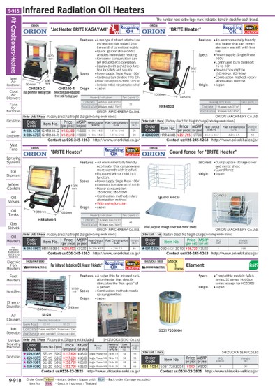 THENUMBERNEXTTOTHELOGOMARKINDICATESITEMSINSTOCKFOREACHBRAND.(DUALPURPOSESTORAGECOVERANDMIRRORSHEET)HRR480B-SHRR480B(GUARDFENCE)EXAMPLE685MM1086MM1086MM685MM1026MM982MMHEATINGINDICATIONTANKCAPACITY(L)CONCRETE126TATAMIMATS(231M240WOODSTRUCTURE90TATAMIMATS(165M2HEATINGINDICATIONTANKCAPACITY(L)CONCRETE126TATAMIMATS(231M2)40WOODSTRUCTURE90TATAMIMATS(165M2)HEATINGINDICATIONTANKCAPACITY(L)CONCRETE64TATAMIMATS(107M2)22WOODSTRUCTURE48TATAMIMATS(78M2)504MM496MMGHR240-G(FULLPERIMETERHEATINGTYPE)GHR240-R(REFLECTIONPLATE-EQUIPPEDFRONTSIDEHEATINGTYPE)HEATINGINDICATIONITEMNO.SE-15SE-20CONCRETE57TATAMIMATS(95M274TATAMIMATS(123M2WOODSTRUCTURE41TATAMIMATS(68M253TATAMIMATS(88M2SE-201595MM345MM1159MMEXAMPLE50317203004870MMORION"JETHEATERBRITEKAGAYAKI"REPAIRINGOKORIONMACHINERYCO.LTD.ORDERUNIT:1PIECEFACTORYDIRECTNOFREIGHTCHARGEEXCLUDINGREMOTEISLANDSORDERCODEITEMNO.PRICE(PERPIECE)MSRP(PERPIECE)HEATOUTPUT(KW/H)FUELCONSUMPTION(L/H)WEIGHT(KG)★826-6736GHR240-G¥132,300¥140,0009.13TO18.21.87TO0.9426★826-6737GHR240-R¥149,310¥158,0009.13TO18.21.87TO0.9428CONTACTUS:026-245-1263HTTP://WWW.ORIONKIKAI.CO.JP/SHIZUOKASEIKIFARINFRAREDRADIATIONOILHEATER"HOKATTO"REPAIRINGOKHEAVYCAUTIONORDERUNIT:1PIECEFACTORYDIRECTSHIPPINGNOTINCLUDEDSHIZUOKASEIKICO.LTDORDERCODEITEMNO.OPTIONSPRICE(PERPIECE)MSRP(PERPIECE)POWER(V)HEATINGOUTPUT(KW/H)TANKCAPACITY(L)WEIGHT(KG)★459-9365SE-1550HZ¥217,620¥248,000SINGLEPHASE10014TO183055★459-9373SE-1560HZ¥217,620¥248,000SINGLEPHASE10014TO183055★459-9381SE-2050HZ¥252,720¥288,000SINGLEPHASE10016TO213065★459-9390SE-2060HZ¥252,720¥288,000SINGLEPHASE10016TO213065CONTACTUS:0538-23-2825HTTP://WWW.SHIZUOKA-SEIKI.CO.JP/ORION"BRITEHEATER"REPAIRINGOKHEAVYCAUTIONORDERCODEITEMNO.PRICE(PERPIECE)MSRP(PERPIECE)HEATOUTPUT(KW/H)FUELCONSUMPTION(L/H)WEIGHT(KG)★494-0997HRR480B-S¥292,950¥310,00024.3TO40.74.2TO2.555CONTACTUS:026-245-1263HTTP://WWW.ORIONKIKAI.CO.JP/ORIONMACHINERYCO.LTD.ORDERUNIT:1PIECEFACTORYDIRECTNOFREIGHTCHARGEEXCLUDINGREMOTEISLANDSFEATURES●ANEWTYPEOFINFRAREDRADIATIONTUBEANDREFLECTIONPLATEREALIZE1.5-FOLDTHEWARMTHOFCONVENTIONALMODELS.●QUICKIGNITION(8SECONDS)ANABLESIMMEDIATEHEATING.●KEROSENECONSUMPTIONCANBEREDUCEDECOOPERATION.●EQUIPPEDWITHACHILDLOCKFUNC-TIONFORSAFETYANDSECURITY.SPECS●POWERSUPPLY:SINGLEPHASE100V●CONTINUOUSBURNDURATION:11TO23H●POWERCONSUMPTION(50/60HZ):51/51W●COMBUSTIONMETHOD:ROTARYATOMIZATIONMETHODORIGIN●JAPANFEATURES●ASUPERTHINFARINFRAREDRADI-ATIONHEATERTHATDIRECTLYSTIMULATESTHE"HOTSPOTS"OFAPERSON.SPECS●COMBUSTIONMETHOD:NOZZLESPRAYINGMETHODORIGIN●JAPANFEATURES●ANENVIRONMENTALLYFRIENDLYECOHEATERTHATCANGENERATEMOREWARMTHWITHLESSFUEL.●EQUIPPEDWITHACHILDLOCKFUNCTION.SPECS●POWERSUPPLY:SINGLEPHASE100V●CONTINUOUSBURNDURATION:15TO16H●POWERCONSUMPTION(50/60HZ):86/99W●COMBUSTIONMETHOD:ROTARYATOMIZATIONMETHOD●WITHSWINGFUNCTIONORIGIN●JAPANSHIZUOKASEIKIELEMENTSTOCK1ITEMSORDERUNIT:1PIECESHIZUOKASEIKICO.LTDORDERCODEITEMNO.PRICE(PERPIECE)MSRP(PERPIECE)SPQ(PIECE)WEIGHT(G)481-105450317203004¥540¥500120CONTACTUS:0538-23-2825HTTP://WWW.SHIZUOKA-SEIKI.CO.JP/ORION"BRITEHEATER"REPAIRINGOKHEAVYCAUTIONORDERCODEITEMNO.PRICE(PERPIECE)MSRP(PERPIECE)HEATOUTPUT(KW/H)FUELCONSUMPTION(L/H)WEIGHT(KG)★494-0989HRR480B¥261,765¥277,00024.3TO40.74.2TO2.552CONTACTUS:026-245-1263HTTP://WWW.ORIONKIKAI.CO.JP/ORIONGUARDFENCEFOR"BRITEHEATER"ORDERCODEITEMNO.PRICE(PERSET)MSRP(PERSET)SPQ(SET)WEIGHT(KG/SET)★491-535603044313010¥36,720¥34,000113.0CONTACTUS:026-245-1263HTTP://WWW.ORIONKIKAI.CO.JP/ORIONMACHINERYCO.LTD.ORDERUNIT:1SETFACTORYDIRECTNOFREIGHTCHARGEEXCLUDINGREMOTEISLANDSORIONMACHINERYCO.LTD.ORDERUNIT:1PIECEFACTORYDIRECTNOFREIGHTCHARGEEXCLUDINGREMOTEISLANDSSPECS●COMPATIBLEMODELS:VAL6SERIES,SESERIES,HOTGUNSERIES(EXCEPTFORHG30RS)ORIGIN●JAPANFEATURES●ANENVIRONMENTALLYFRIENDLYECOHEATERTHATCANGENER-ATEMOREWARMTHWITHLESSFUEL.SPECS●POWERSUPPLY:SINGLEPHASE100V●CONTINUOUSBURNDURATION:15TO16H●POWERCONSUMPTION(50/60HZ):82/96W●COMBUSTIONMETHOD:ROTARYATOMIZATIONMETHODORIGIN●JAPANSETCONTENTS●DUALPURPOSESTORAGECOVERANDMIRRORSHEET●GUARDFENCEORIGIN●JAPANAIRCONDITIONERS・HEATERSSPOTAIRCONDITIONERSCOOLAIRBLOWERSFANSFORFACTORIESCIRCULATORSAIRCONDITIONERSMISTFANSSPRAYINGSYSTEMSICEDISPENSERSWATERCOOLERSOILSTOVESOILTANKSGASSTOVESOILHEATERSFARINFRAREDRADIATIONELECTRICITYHEATERSELECTRICFANHEATERSFOOTHEATERSHUMIDIFIERSDRYERS・DEHUMIDIFIERSAIRCLEANERSIONGENERATORSSMOKESEPARATINGMACHINESDEODORIZERSINFRAREDRADIATIONOILHEATERS9-918*0521924*9-918ORDERCODEYELLOW…INSTANTDELIVERY(JAPANONLY)BLUE…BACKORDER(CARRIAGEEXCLUDED)ITEMNO.PINK…STOCKININDONESIA/THAILAND