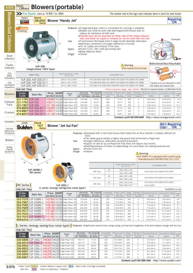 THENUMBERNEXTTOTHELOGOMARKINDICATESITEMSINSTOCKFOREACHBRAND.HJF-200(SINGLEPHASE100VTYPE)BIDIRECTIONALMUCTMOUNTABLEFORDELIVERY/EXHAUSTAIRINSIDETHETANKFORDELIVERY/EXHAUSTAIRINSIDETHETANKEXAMPLEWHENEXHAUSTINGBLOWERATINSPIRATIONFLEXIBLEDUCTSAREATTACHEDTOBOTHTHEINTAKEANDEXHAUSTSIDE.ITEMNO.OUTERDIMENSION(MM)WXDXHCOMPATIBLEDUCTHJF-200,HJF-200-2V-1245.0X314X325.5TFD-230S/RFD-230S/TFD-230FA/TFD-230D/TFD-230DE/TFD-230BSHJF-250,HJF-250-2V-1295.5X315X375.5TFD-280S/RFD-280S/TFD-280FA/TFD-280D/TFD-280DE/TFD-280BSHJF-300,HJF-300-2V-1351.5X360X416.5TFD-320S/TFD-320FA/RFD-320S/RFD-320G/TFD-320DE/TFD-320BSOUTERDIMENSION(MM)WXDXHCOMPATIBLEDUCT200CLASSRS300X305X337SJFD-230S/SJFD-230SP/SJFD-230PCL360X382X380250CLASSRS360X307X393SJFD-280S/SJFD-280SP/SJFD-280PCL390X390X423300CLASSRS390X332X432SJFD-320S/SJFD-320SP/SJFD-320PC/L440X405X471SJFD-320PETSJF-300RS-1(RSSERIES)SJF-200L-1(LSERIES(ENERGYSAVING/LOWNOISETYPE))DWHFORDUCTS,SEEP.9-981TO984DWHTRUSCOBLOWER"HANDYJET"REPAIRINGOKSUIDENBLOWER"JETSUIFAN"MADETOORDERREPAIRINGOKORDERCODEITEMNO.PRICE(PERPIECE)MSRP(PERPIECE)POWER(V)ELECTRICITYCONSUMPTION(W)(50/60HZ)AIRVOLUME(M3/MIN)(50/60HZ)COMPATIBLEDUCTDIAMETER(MM)NOISELEVEL(DB(A))(50/60HZ)BLADEDIAMETER(MM)NUMBEROFFANBLADES(SHEETS)STANDARDELECTRICCONSUMPTIONRATEWEIGHT(KG)(50HZ)(60HZ)336-5808SJF-200L-1¥48,803¥48,200SINGLEPHASE100100/11517/2023065.0/68.020042.70YEN/H3.11YEN/H8.7336-5816SJF-200L-2¥48,803¥48,200SINGLEPHASE200100/11517/2023065.0/68.020042.70YEN/H3.11YEN/H8.7336-5824SJF-250L-1¥54,473¥53,800SINGLEPHASE100160/18528/3428068.5/72.025044.32YEN/H5.00YEN/H10.5336-5832SJF-250L-2¥54,473¥53,800SINGLEPHASE200160/18528/3428068.5/72.025044.32YEN/H5.00YEN/H10.5336-5841SJF-300L-1¥63,078¥62,300SINGLEPHASE100345/43544/5332071.0/74.528849.31YEN/H11.75YEN/H14.5336-5859SJF-300L-2¥63,078¥62,300SINGLEPHASE200345/40044/5332071.0/74.528849.31YEN/H10.80YEN/H14.5336-5867SJF-300L-3¥63,078¥62,300THREEPHASE200300/39044/5332071.0/74.528844.05YEN/H7.16YEN/H14.5CONTACTUS:0120-285-240HTTP://WWW.SUIDEN.COM/ORDERCODEITEMNO.PRICE(PERPIECE)MSRP(PERPIECE)POWER(V)ELECTRICITYCONSUMPTION(W)(50/60HZ)AIRVOLUME(M3/MIN)(50/60HZ)COMPATIBLEDUCTDIAMETER(MM)NOISELEVEL(DB(A))(50/60HZ)BLADEDIAMETER(MM)NUMBEROFFANBLADES(SHEETS)STANDARDELECTRICCONSUMPTIONRATEWEIGHT(KG)(50HZ)(60HZ)353-7579SJF-200RS-1¥27,642¥27,300SINGLEPHASE100170/26020/2423077.5/80.020064.59YEN/H7.02YEN/H8.0353-7587SJF-200RS-2¥27,642¥27,300SINGLEPHASE200175/27020/2423077.5/80.020064.73YEN/H7.29YEN/H8.0353-7595SJF-250RS-1¥29,160¥28,800SINGLEPHASE100265/37035/4028083.5/87.025067.16YEN/H9.99YEN/H9.1353-7609SJF-250RS-2¥29,160¥28,800SINGLEPHASE200265/36035/4028083.5/87.025067.16YEN/H9.72YEN/H9.1353-7617SJF-300RS-1¥31,893¥31,500SINGLEPHASE100405/56050/5832080.0/83.0288410.90YEN/H15.12YEN/H12.8353-7625SJF-300RS-2¥31,893¥31,500SINGLEPHASE200415/53050/5832080.0/83.0288411.21YEN/H14.31YEN/H12.8353-7633SJF-300RS-3¥31,893¥31,500THREEPHASE200380/52050/5832080.0/83.028845.13YEN/H7.02YEN/H12.8494-6316SJF-300RS-1P¥35,133¥34,700SINGLEPHASE100405/56050/5832080.0/83.0288410.94YEN/H15.12YEN/H12.8ORDERCODEITEMNO.PRICE(PERPIECE)MSRP(PERPIECE)POWER(V)ELECTRICITYCONSUMPTION(W)(50/60HZ)AIRVOLUME(M3/MIN)(50/60HZ)COMPATIBLEDUCTDIAMETER(MM)NOISELEVEL(DB(A))(50/60HZ)BLADEDIAMETER(MM)NUMBEROFFANBLADES(SHEETS)STANDARDELECTRICCONSUMPTIONRATEWEIGHT(KG)(50HZ)(60HZ)221-1785HJF-200¥26,892¥33,200SINGLEPHASE100135/20019/2323071/7420063.65YEN/H5.40YEN/H7.0221-1793HJF-250¥28,512¥35,200SINGLEPHASE100210/30034/3728076/7725065.67YEN/H8.10YEN/H9.0221-1807HJF-300¥31,185¥38,500SINGLEPHASE100405/56052/6032078/81290410.94YEN/H15.12YEN/H12.5474-8859HJF-200-2V-1¥26,892¥33,200SINGLEPHASE200135/20019/2323071/7420061.82YEN/H2.70YEN/H7.0474-8867HJF-250-2V-1¥28,512¥35,200SINGLEPHASE200210/30034/3728076/7725062.84YEN/H4.05YEN/H9.0474-8875HJF-300-2V-1¥31,185¥38,500SINGLEPHASE200405/56052/6032078/8129045.47YEN/H7.56YEN/H12.5CONTACTUS:0120-509-849HTTP://WWW.ORANGE-BOOK.COM/STOCK157ITEMSSTOCK38,650ITEMSORDERUNIT:1PIECE(PRICEREVISIONDATE:JAN,2016)TRUSCONAKAYAMACORPORATIONORDERUNIT:1PIECESUIDENCO.LTDORDERUNIT:1PIECEDRAWING.COMFEATURES●ALARGEBANDGRIP,WHICHISCONVENIENTFORCARRYING,ISADOPTED.●REALIZELOWNOISEBYBOTHSIDEBELL-SHAPEDBELL-MOUSESPECTOREDUCEAIRRESISTANCEATBOTHEND.●FLEXIBLEDUCTCANBEMOUNTEDONEITHERSIDEOFTHEINTAKE/EXHAUSTSIDE,ANDEITHERAIRSUPPLYOREXHAUSTAIRCANBEUSEDWITHONEUNIT.USE●TRANSMISSION/DISCHARGEWINDINLARGEMOUTHDIAMETERSTEELPIPE.●MANHOLES,PREVENTIONOFOXYGENDEFICIENCYINTUNNELS.●FORAIRSUPPLYANDEXHAUSTINTHETANK.SPECS●POWERCORD:1.8M(WITHGROUNDINGCLIP)●BLADEMATERIAL:RESINORIGIN●TAIWANFEATURES●EQUIPPEDWITHARESINBELLMOUSETHATMAKESTHEAIRFLOWSMOOTH,ITREALIZESEFFICIENTAIRBLOW.●THESAFETYGUARDADOPTSAHIGHLYSAFEGUARDTHATPERFORMEDAFINGERTEST.USE●OXYGENDEFICIENCY,SUFFOCATIONACCIDENTPREVENTION.●SUPPLYOFCOLDAIRASAEXHAUSTFANTHATDOESNOTREQUIREDUCTWORKS.●WELDING/EXHAUSTOFFUMESOFSHIPBUILDING,IRONANDSTEEL,CANMAKINGFACTORIESETC.SPECS●POWERCORD:2MORIGIN●TAIWANRSSERIESFEATURES●SIGNIFICANTLYREDUCEDNOISE,ENERGYSAVING,ANDIMPROVEDSTRAIGHTNESSOFTHEWINDREALIZEDADESIGNWITHLESSLOSS.LSERIES(ENERGYSAVING/LOWNOISETYPE)●NOTEXPLOSION-PROOFTYPE.WARNING●SJF-300RS-1PISEQUIPPEDWITHAPOKKINPLUG(MANUFACTUREDBYNICHIDOIND.CO.,LTD.).WARNINGBLOWERS・DUSTCOLLECTORSDUSTCOLLECTORSFUMECOLLECTORSOILMISTELIMINATORSOILCONTENTSEPARATORSBLOWERSEXHAUSTFANSCRUSHERSINCINERATORSNOISEREDUCTIONPRODUCTSBOILERSSOLARPANELSYSTEMSSTOCK138ITEMSBLOWERS(PORTABLE)9-976*0523090*9-976ORDERCODEYELLOW…INSTANTDELIVERY(JAPANONLY)BLUE…BACKORDER(CARRIAGEEXCLUDED)ITEMNO.PINK…STOCKININDONESIA/THAILAND
