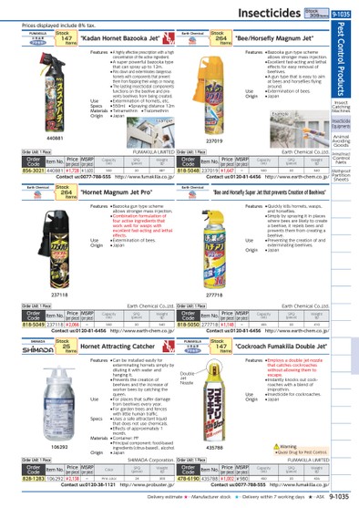 PRICESDISPLAYEDINCLUDE8%TAX.440881EXAMPLE237118106292237019EXAMPLE277718435788DOUBLEJETNOZZLEFUMAKILLA"KADANHORNETBAZOOKAJET"STOCK147ITEMSORDERUNIT:1PIECEFUMAKILLALIMITEDORDERCODEITEMNO.PRICE(PERPIECE)MSRP(PERPIECE)CAPACITY(ML)SPQ(PIECE)WEIGHT(G)856-3021440881¥1,728¥1,60055020487CONTACTUS:0077-788-555HTTP://WWW.FUMAKILLA.CO.JP/SHIMADAHORNETATTRACTINGCATCHERSTOCK25ITEMSEARTHCHEMICAL"HORNETMAGNUMJETPRO"STOCK264ITEMSORDERUNIT:1PIECESHIMADACORPORATION.ORDERCODEITEMNO.PRICE(PERPIECE)MSRP(PERPIECE)COLORSPQ(PIECE)WEIGHT(G)828-1283106292¥2,138-PINKCOLOR24300CONTACTUS:0120-38-1121HTTP://WWW.PROBUSTER.JP/ORDERCODEITEMNO.PRICE(PERPIECE)MSRP(PERPIECE)CAPACITY(ML)SPQ(PIECE)WEIGHT(G)818-5049237118¥2,066-55020540CONTACTUS:0120-81-6456HTTP://WWW.EARTH-CHEM.CO.JP/ORDERUNIT:1PIECEEARTHCHEMICALCO.,LTD.FEATURES●AHIGHLYEFFECTIVEPRESCRIPTIONWITHAHIGHCONCENTRATIONOFTHEACTIVEINGREDIENT.●ASUPERPOWERFULBAZOOKATYPETHATCANSPRAYUPTO12M.●PINSDOWNANDEXTERMINATESDANGEROUSHORNETSWITHCOMPONENTSTHATPREVENTTHEMFROMFLAPPINGTHEIRWINGSORMOVING.●THELASTINGINSECTICIDALCOMPONENTSFUNCTIONSONTHEBEEHIVEANDPRE-VENTSBEEHIVESFROMBEINGCREATED.USE●EXTERMINATIONOFHORNETS,ETC.SPECS●550ML●SPRAYINGDISTANCE12MMATERIALS●TETRAMETHRIN●TRALOMETHRINORIGIN●JAPANFEATURES●CANBEINSTALLEDEASILYFOREXTERMINATINGHORNETSSIMPLYBYDILUTINGITWITHWATERANDHANGINGIT.●PREVENTSTHECREATIONOFBEEHIVESANDTHEINCREASEOFWORKERBEESBYCATCHINGTHEQUEEN.USE●FORPLACESTHATSUFFERDAMAGEFROMBEEHIVESEVERYYEAR.●FORGARDENTREESANDFENCESWITHLITTLEHUMANTRAFFIC.SPECS●USESASAFEATTRACTANTLIQUIDTHATDOESNOTUSECHEMICALS.●EFFECTSOFAPPROXIMATELY1MONTH.MATERIALS●CONTAINER:PP●PRINCIPALCOMPONENT:FOOD-BASEDINGREDIENTS(CITRUS-BASED),ALCOHOLORIGIN●JAPANFEATURES●BAZOOKAGUNTYPESCHEMEALLOWSSTRONGERMASSINJECTION.●COMBINATIONFORMULATIONOFFOURACTIVEINGREDIENTSTHATWORKWELLFORWASPSWITHEXCELLENTFAST-ACTINGANDLETHALEFFECTS.USE●EXTERMINATIONOFBEES.ORIGIN●JAPANORDERCODEITEMNO.PRICE(PERPIECE)MSRP(PERPIECE)CAPACITY(ML)SPQ(PIECE)WEIGHT(G)818-5048237019¥1,647-55020540CONTACTUS:0120-81-6456HTTP://WWW.EARTH-CHEM.CO.JP/ORDERUNIT:1PIECEEARTHCHEMICALCO.,LTD.STOCK264ITEMSEARTHCHEMICAL"BEE/HORSEFLYMAGNUMJET"EARTHCHEMICAL"BEEANDHORSEFLYSUPERJETTHATPREVENTSCREATIONOFBEEHIVES"ORDERCODEITEMNO.PRICE(PERPIECE)MSRP(PERPIECE)CAPACITY(ML)SPQ(PIECE)WEIGHT(G)818-5050277718¥1,148-45520410CONTACTUS:0120-81-6456HTTP://WWW.EARTH-CHEM.CO.JP/ORDERUNIT:1PIECEEARTHCHEMICALCO.,LTD.FUMAKILLA"COCKROACHFUMAKILLADOUBLEJET"ORDERCODEITEMNO.PRICE(PERPIECE)MSRP(PERPIECE)CAPACITY(ML)SPQ(PIECE)WEIGHT(G)478-6190435788¥1,002¥98045020426CONTACTUS:0077-788-555HTTP://WWW.FUMAKILLA.CO.JP/ORDERUNIT:1PIECEFUMAKILLALIMITEDSTOCK147ITEMSFEATURES●BAZOOKAGUNTYPESCHEMEALLOWSSTRONGERMASSINJECTION.●EXCELLENTFAST-ACTINGANDLETHALEFFECTSFOREASYREMOVALOFBEEHIVES.●AGUNTYPETHATISEASYTOAIMATBEESANDHORSEFLIESFLYINGAROUND.USE●EXTERMINATIONOFBEES.ORIGIN●JAPANFEATURES●EMPLOYSADOUBLEJETNOZZLETHATCATCHESCOCKROACHESWITHOUTALLOWINGTHEMTOESCAPE.●INSTANTLYKNOCKSOUTCOCK-ROACHESWITHABLENDOFIMIPROTHRIN.USE●INSECTICIDEFORCOCKROACHES.ORIGIN●JAPANFEATURES●QUICKLYKILLSHORNETS,WASPS,ANDHORSEFLIES.●SIMPLYBYSPRAYINGITINPLACESWHEREBEESARELIKELYTOCREATEABEEHIVE,ITREPELSBEESANDPREVENTSTHEMFROMCREATINGABEEHIVE.USE●PREVENTINGTHECREATIONOFANDEXTERMINATINGBEEHIVES.ORIGIN●JAPAN●QUASIDRUGFORPESTCONTROL.WARNINGPESTCONTROLPRODUCTSINSECTCATCHINGMACHINESINSECTICIDEEQUIPMENTSANIMALAVOIDINGGOODSANIMAL/INSECTCONTROLNETSMOTHPROOFPARTITIONSHEETSINSECTICIDESSTOCK308ITEMS9-1035*0525692*9-1035DELIVERYESTIMATE★…MANUFACTURERSTOCK★…DELIVERYWITHIN7WORKINGDAYS★…ASK
