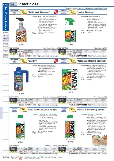 THENUMBERNEXTTOTHELOGOMARKINDICATESITEMSINSTOCKFOREACHBRAND.432633282415426885432640242617426878EXAMPLEEARTHCHEMICAL"SLUGDRY"STOCK264ITEMSORDERUNIT:1PIECEEARTHCHEMICALCO.,LTD.ORDERCODEITEMNO.PRICE(PERPIECE)MSRP(PERPIECE)CAPACITY(ML)SPQ(PIECE)WEIGHT(G)828-5227282415¥1,058¥98022020255CONTACTUS:0120-81-6456HTTP://WWW.EARTH-CHEM.CO.JP/FUMAKILLA"KADAN®SLUGATTRACTINGGRANULARINSECTICIDE"STOCK147ITEMSORDERUNIT:1PIECEFUMAKILLALIMITEDORDERCODEITEMNO.PRICE(PERPIECE)MSRP(PERPIECE)CAPACITY(G)SPQ(PIECE)WEIGHT(G)796-1189426885¥689¥84025018305CONTACTUS:0077-788-555HTTP://WWW.FUMAKILLA.CO.JP/EARTHCHEMICAL"SPIDERWEBELIMINATOR"STOCK264ITEMSORDERUNIT:1PIECEEARTHCHEMICALCO.,LTD.ORDERCODEITEMNO.PRICE(PERPIECE)MSRP(PERPIECE)CAPACITY(ML)SPQ(PIECE)WEIGHT(G)854-9872242617¥1,047-1000121120CONTACTUS:0120-81-6456HTTP://WWW.EARTH-CHEM.CO.JP/FEATURES●WRAPSSLUGSINAPOWDERTOINSTANTANEOUSLYSTOPMOTIONANDEXTERMINATETHEMBYDRYINGTHEM.●AHANDLE-TYPESPRAYTHATISEASYTOHOLD.USE●EXTERMINATIONOFSLUGS.ORIGIN●JAPANFEATURES●AGRANULARTYPETHATCANBEEASILYSPRINKLEDINLARGERYARDSINORDERTOINCREASETHECHANCESOFCONTACTWITHSLUGSANDSNAILS,ETC.●WITHMETALDEHYDEHAVINGHIGHATTRACTIONANDINSECTICIDALEFFECTSASTHEMAINCOMPONENT,THEADDITIONOFBREWER'SYEASTINCREASESITSATTRACTION.USE●EXTERMINATIONOFSLUGS.ORIGIN●JAPANFEATURES●HASAWEBBUILDING-INHIBITINGEFFECTTHATPREVENTSSPIDERWEBSFROMBEINGCREATEDFORAPPROXIMATELY3MONTHS.●HASINSECTICIDAL,EGGEXTERMINATION,ANDAMBUSHEDEXTERMINATIONEFFECTS.●PLANT-FRIENDLY,EASYTOUSEONGARDENTREES,ANDDOENOTAFFECTCOMPONENTS.USE●EXTERMINATIONOFSPIDERS.ORIGIN●JAPANFUMAKILLA"KADAN®GRANULARSLUGBARRIER"STOCK147ITEMSORDERUNIT:1PIECEFUMAKILLALIMITEDORDERCODEITEMNO.PRICE(PERPIECE)MSRP(PERPIECE)CAPACITY(G)SPQ(PIECE)WEIGHT(G)419-8085432640¥675¥7707008780CONTACTUS:0077-788-555HTTP://WWW.FUMAKILLA.CO.JP/FUMAKILLA"KADAN®SLUGSPRAY"STOCK147ITEMSORDERUNIT:1PIECEFUMAKILLALIMITEDORDERCODEITEMNO.PRICE(PERPIECE)MSRP(PERPIECE)CAPACITY(ML)SPQ(PIECE)WEIGHT(G)796-1219432633¥675¥65045018500CONTACTUS:0077-788-555HTTP://WWW.FUMAKILLA.CO.JP/FUMAKILLA"KADAN®SLUGATTRACTINGINSECTICIDE"STOCK147ITEMSORDERUNIT:1BOXFUMAKILLALIMITEDORDERCODEITEMNO.PRICE(PERBOX)MSRP(PERBOX)Q'TYPERBOX(PIECE)SPQ(BOX)WEIGHT(G/BOX)796-1171426878¥527¥54081884CONTACTUS:0077-788-555HTTP://WWW.FUMAKILLA.CO.JP/FEATURES●THEACTIVEINGREDIENTISDL-MALICACID.●THEACTIVEINGREDIENTISFOOD-BASEDSOITCANBESAFELYUSED.●ITISRESISTANTTORAINANDEFFECTSWILLLASTFORAPPROXIMATELY1.5MONTHS.●ITCANBEDIRECTLYSPRINKLEDFOREXTERMINATIONINWHICHCASETHEGRAINSWILLWRAPTHESLUGANDALLOWFOREASYCLEANUP.●SIMPLYSPRINKLINGTHISPRODUCTWILLREPELSLUGS.USE●EXTERMINATIONOFSLUGS.ORIGIN●JAPANFEATURES●SPRAYEDONSLUGSFORFAST-ACTINGEXTERMINATION.●100%FOOD-BASEDCOMPONENTS.●AFTERTHISPRODUCTISSPRAYED,EFFECTSOFREPELLINGSLUGSFROMTHEPLACEWHERETHEPRODUCTWASSPRAYEDWILLLASTFORAPPROXIMATELY1WEEK.USE●EXTERMINATIONOFSLUGS.ORIGIN●JAPANFEATURES●ATTRACTSANDEXTERMINATESSLUGSSIMPLYBYBEINGPLACED.●ACONTAINERDESIGNTHATISRESISTANTTORAINANDSPRAYEDWATERWHICHENABLESLONG-LASTINGEFFECTS.●EFFECTSWILLLASTFORAPPROX.1TO3MONTHSAFTERINSTALLATION.USE●EXTERMINATIONOFSLUGS.ORIGIN●JAPANPESTCONTROLPRODUCTSINSECTCATCHINGMACHINESINSECTICIDEEQUIPMENTSANIMALAVOIDINGGOODSANIMAL/INSECTCONTROLNETSMOTHPROOFPARTITIONSHEETSSTOCK308ITEMSINSECTICIDES9-1044*0525753*9-1044ORDERCODEYELLOW…INSTANTDELIVERY(JAPANONLY)BLUE…BACKORDER(CARRIAGEEXCLUDED)ITEMNO.PINK…STOCKININDONESIA/THAILAND