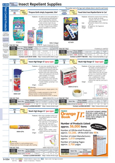 THENUMBERNEXTTOTHELOGOMARKINDICATESITEMSINSTOCKFOREACHBRAND.MMH-GSP182MM575814575913576019437409FORANARROWPLACESUCHASINABOXINSIDEBOXFORINSIDETHEMALLS!MUSHIHIGHRANGERG(PENTYPE)NEWITEMNO.CASEQ'TYPERPACKMINQ'TYPERPACKSTANDARDPRICEMMH-GPNOPENPRICE●PLACETHATISLIKELYTOBEANUNPLEASANTPESTPATH,ORAPLACEYOUDONOTWANTHABITATPENTYPEREPELLENTWHICHCANBEPAINTEDEASILY.●PUTITINSIDETHEOUTLETBRAIDBOX,THEWALLBACK,INTHEPIPINGOFTHEMALLETCANDUSEIT.●ALCOHOLBASEDINKTHATTAKESVOCREGULATIONSINCONSIDERATIONISUSED.●SINCETHECOATINGCOLORISYELLOW,ITBECOMESAMEASUREOFUNEVENCOATING,THEDEGREEOFPAINT.ORMORECOATINGCANBEDONE.●CANBECOLORCOATEDONVARIOUSMATERIALSSUCHASPLASTIC,PAPER,RUBBERANDMETAL.●JUSTCAP,EASYTOSTORE.●PUTITONAfiLMETC.WHERETHEMARKERDOESNOTREACH,CUTIT,PASTEITANDUSEITIWILL.MUSHIHIGHRANGERG(TAPETYPE)NEWPULLOUTTHEENDOFTHETAPEFROMTHEDRAWER,INSERTITINTHEPLUG-INCOVERPARTANDSTOREITIWILL.CONVENIENTWITHDRAWERINSIDEBOXFORINSIDETHEMALLS!DRUGRELEASEPAPERVISCOSITYTAPEMUSHIHIGHRANGERGINTHEBOXBEHINDTHEWALLIFYOUPASTEAROUNDTHEBOX,THEAPPEARANCEOFINSECTSCANPREVENT!FROMTHEGAPONTHEWALLS,ETC.INSECTSMAYCOMEOUT...ALSOINSUCHPLACESITEMNO.WIDTHLENGTHCASEQ'TYPERPACKMINQ'TYPERPACKSTANDARDPRICEMMH-GT4010OPENPRICE●PLACETHATISLIKELYTOBEANUNPLEASANTPESTPATH,ORAPLACEYOUDONOTWANTHABITATTAPETYPEREPELLENTWHICHCANBEEASILYCUTANDPASTE.●POOLBOX,WALLBOX,INSIDETHESWITCHBOARD,ETC.,INSIDETHEMALLANDWALLETCPASTEANDUSEIT.●YOUCANUSEITBYCUTTINGASMUCHASYOULIKE.●REPELLENTEffECTLASTSLONG.802014MUSHIHIGHRANGERMMH-GPNMMH-GT4010WIDTHINSIDEBOXFORINSIDETHEMALLS!●CLASS4ALCOHOL(ISOPROPANOL),DANGERGRADE2,FIREPROHIBITED.●ORALTOXICITYISROUGHLYEQUIVALENTTOTHATOFSALT.●PLEASEHANDLEINAWELL-VENTILATEDPLACE.●DONOTEXPOSETOTEMPERATURESOF40℃ORABOVE.WARNINGNUMBEROFPRODUCTSLISTED:APPROX.56,000ITEMSNUMBEROFOff-THE-SHELFPRODUCTS:APPROX.53,200,Off-THE-SHELFRATIO95%NUMBEROFLISTEDMANUFACTURERS:APPROX.1,419COMPANIESNUMBEROFCATALOGPAGES:APPROX.2,700PAGESORDERCODEITEMNO.PRICE(TAXNOTINCLUDED)858-5867OBJM2018E¥5,500PUBLISHEDONCEEVERY2YEARSAPRO-TOOLCOMPACTCATALOGTHATLISTSAWIDEVARIETYOFPRODUCTSALLINONE,INCLUDINGNEARLYEVERYCATEGORYONORANGE-BOOK!●PLEASEHANDLEINAWELL-VENTILATEDPLACE.●PLEASEWASHYOURHANDSTHOROUGHLYAFTERHANDLING.WARNINGEARTHCHEMICAL"PIREPARAEARTHSIMPLYSUSPENDED,SLIM"STOCK264ITEMSORDERUNIT:1BAGEARTHCHEMICALCO.,LTD.ORDERCODEITEMNO.PRICE(PERBAG)MSRP(PERBAG)EFFECTDURATIONFRAGRANCEQ'TYPERBAG(PIECE)WEIGHT(G/BAG)818-5064575814¥878-APPROX.1YEARUNSCENTED10130818-5065575913¥878-APPROX.1YEARFLORALSOAPSCENT10130818-5066576019¥878-APPROX.1YEARSCENTOFAROMASOAP10130CONTACTUS:0120-81-6456HTTP://WWW.EARTH-CHEM.CO.JP/MIRAI"MUSHIHIGHRANGERG"(PENTYPE)STOCK87ITEMSORDERUNIT:1PIECEMIRAIINDUSTRYCO.LTDORDERCODEITEMNO.PRICE(PERPIECE)MSRP(PERPIECE)COLORUSAGESTANDARD(M2)SPQ(PIECE)WEIGHT(G)494-6642MMH-GPN¥3,146-YELLOW3.61070CONTACTUS:0584-68-0001HTTP://WWW.MIRAI.CO.JP/SPQ:12BAGSFEATURES●INADDITIONTOTHEINSECT-REPELLINGEFFECT,ITALSOHASDEODORIZING,YELLOWING-PREVENT-ING,ANDMOLD-PREVENTINGCOMPONENTS.●ANECOCONTAINERTHATISTHETHINNESTINTHEINDUSTRYANDDOESNOTGETINTHEWAY.●ALARGEVOLUMEPACKOF10PIECESFORUSEIN2LARGECLOSETS(2500L).USE●INSECTREPELLENTFORCLOTHES.ORIGIN●JAPANMIRAI"INSECTHIGHRANGERG"(SPRAYTYPE)STOCK87ITEMSORDERCODEITEMNO.PRICE(PERPIECE)MSRP(PERPIECE)CAPACITY(ML)OUTERDIAMETERXH(MM)SPQ(PIECE)WEIGHT(G)494-6651MMH-GSP¥5,387-30060X18220320CONTACTUS:0584-68-0001HTTP://WWW.MIRAI.CO.JP/FEATURES●ASPRAYTYPEREPELLENTTHATCANBESPRAYED.(NOINSECTICIDALEFFECTS)●USEDBYBEINGSPRAYEDINSIDEELEC-TRICALCONDUITSANDINSIDEBOXES.●QUICKLYDRIESWITHNATURALDRYING.(TIMEUNTILHARDENEDTOTHETOUCHAPPROXIMATELY10MINUTES)●ITISSUITABLEASACOATINGBECAUSEITHASALOWVISCOSITY.●THEEMPLOYMENTOFA2-WAYNOZZLEENABLESSPRAYINGINNAR-ROWSPACES.ORIGIN●JAPANFEATURES●PENTYPEREPELLENTWHICHCANBEPAINTEDEASILY.(NOINSECTI-CIDALEFFECT)●PUTITINTHEOUTLETBRAIDBOX,THEWALLBACK,INTHEPIPINGOFTHEMOLE,ETC.ANDUSEIT.●ALCOHOLBASEDINKTHATTAKESVOCREGULATIONSINCONSIDERA-TIONISUSED.USE●PLASTIC,PAPER,RUBBER,COLOR,METALANDVARIOUSMATERIALS.ORIGIN●JAPANFUMAKILLA"KAWAIISELECTINSECTREPELLENTBARRIERFORCARS"STOCK147ITEMSORDERUNIT:1PIECEFUMAKILLALIMITEDORDERCODEITEMNO.PRICE(PERPIECE)MSRP(PERPIECE)USAGEGUIDESPQ(PIECE)WEIGHT(G)759-3945437409¥508¥47090TO120DAYS2438CONTACTUS:0077-788-555HTTP://WWW.FUMAKILLA.CO.JP/MIRAI"MUSHIHIGHRANGERG"(TAPETYPE)STOCK87ITEMSORDERUNIT:1PIECEMIRAIINDUSTRYCO.LTDORDERCODEITEMNO.PRICE(PERPIECE)MSRP(PERPIECE)WXL(MMXM)SPQ(PIECE)WEIGHT(G)494-6669MMH-GT4010¥6,318-40X1050250CONTACTUS:0584-68-0001HTTP://WWW.MIRAI.CO.JP/ORDERUNIT:1PIECEMIRAIINDUSTRYCO.LTDFEATURES●PREVENTSINSECTSFROMENTERINGTHECARSIMPLYBYBEINGCLIPPEDONTOTHESUNSHADEONTHEPASSENGER'SSIDE.USE●PREVENTSINSECTSFROMENTERINGTHECAR.SPECS●FRAGRANCE:NOFRAGRANCEORIGIN●JAPANFEATURES●TAPETYPEREPELLENTWHICHCANBEEASILYCUTANDPASTEDTOAPLACETHATISLIKELYTOBEANUNPLEASANTPESTPATH,ORAPLACEWHEREYOUDONOTWANTTOLIVE.(NOINSECTICIDALEFFECT)●PASTEINAPOOLBOX,AWALLBOX,ADISTRIBUTIONSWITCH-BOARDBRAID,INSIDEAMALL,BEHINDTHEWALLETCANDUSEIT.ORIGIN●JAPANPESTCONTROLPRODUCTSINSECTCATCHINGMACHINESINSECTICIDEEQUIPMENTSANIMALAVOIDINGGOODSANIMAL/INSECTCONTROLNETSMOTHPROOFPARTITIONSHEETSSTOCK308ITEMSINSECTREPELLENTSUPPLIES9-1054*0525602*9-1054ORDERCODEYELLOW…INSTANTDELIVERY(JAPANONLY)BLUE…BACKORDER(CARRIAGEEXCLUDED)ITEMNO.PINK…STOCKININDONESIA/THAILAND