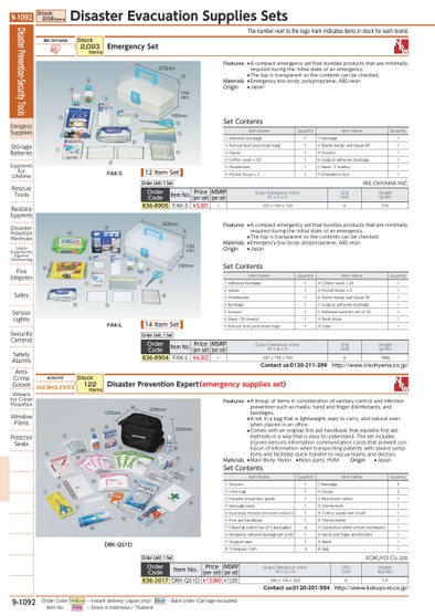 THENUMBERNEXTTOTHELOGOMARKINDICATESITEMSINSTOCKFOREACHBRAND.ITEMNAMEQUANTITYITEMNAMEQUANTITY①ADHESIVEBANDAGE1⑧COTTONSWABX201②GAUZE1⑨POCKETTISSUEX21③DISINFECTANT1⑩STERILEHANDYWETTISSUE3P1④BANDAGE1⑪SURGICALADHESIVEBANDAGE1⑤SCISSORS1⑫ADHESIVEWARMER,SETOF101⑥MASK(30SHEETS)1⑬BODYWIPE1⑦PULL-OUTDUSTPACK(TRASHBAG)1⑭CASE1SETCONTENTSITEMNAMEQUANTITYITEMNAMEQUANTITY①SCISSORS1⑪BANDAGE3②VINYLBAG1⑫GAUZE3③DISASTERPREVENTIONGUIDE1⑬ABSORBENTCOTTON1④MESSAGELABEL1⑭DISINFECTANT1⑤INJUREDPERSONSINFORMATIONCOMMUNICATIONCARD(SETOF5)1⑮COTTONSWABS(SETOF60)1⑥FIRSTAIDHANDBOOK1⑯THERMOMETER1⑦CLEANINGCOTTON(SETOF3PACKAGES)4⑰DUALPURPOSESPLINTERREMOVERANDTWEEZERS1⑧EMERGENCYADHESIVEBANDAGE(SETOF50)1⑱HANDANDFINGERDISINFECTANT1⑨SURGICALTAPE1⑲MASK1⑩TRIANGULARCLOTH3⑳BAG1SETCONTENTSDRK-QS1D200MM245MM125MMITEMNAMEQUANTITYITEMNAMEQUANTITY①ADHESIVEBANDAGE1⑦BANDAGE1②PULL-OUTDUSTPACK(TRASHBAG)1⑧STERILEHANDYWETTISSUE3P1③GAUZE1⑨SCISSORS1④COTTONSWABX201⑩SURGICALADHESIVEBANDAGE1⑤DISINFECTANT1⑪MASK(7SHEETS)1⑥POCKETTISSUEX21⑫EMERGENCYBOX1SETCONTENTS325MM190MM150MM270MM150MM160MM①①②②③③④④⑤⑤⑥⑥⑦⑦⑧⑧⑨⑨⑩⑩⑪⑪⑫⑫⑬⑭FAK-LFAK-S①②③④⑤⑥⑦⑧⑨⑩⑪⑫⑬⑭⑮⑯⑰⑱⑲⑳IRISOHYAMAEMERGENCYSETSTOCK2,093ITEMSKOKUYODISASTERPREVENTIONEXPERT(EMERGENCYSUPPLIESSET)STOCK122ITEMSORDERUNIT:1SETKOKUYOCO.,LTD.ORDERCODEITEMNO.PRICE(PERSET)MSRP(PERSET)OUTERDIMENSION(MM)WXDXHSPQ(SET)WEIGHT(KG/SET)836-2017DRK-QS1D¥12,960¥12,000245X125X20081.3CONTACTUS:0120-201-594HTTP://WWW.KOKUYO-ST.CO.JP/ORDERUNIT:1SETORDERCODEITEMNO.PRICE(PERSET)MSRP(PERSET)OUTERDIMENSION(MM)WXDXHSPQ(SET)WEIGHT(G/SET)836-8904FAK-L¥4,302-325X190X15061860CONTACTUS:0120-211-299HTTP://WWW.IRISOHYAMA.CO.JP/ORDERUNIT:1SETIRISOHYAMAINC.ORDERCODEITEMNO.PRICE(PERSET)MSRP(PERSET)OUTERDIMENSION(MM)WXDXHSPQ(SET)WEIGHT(G/SET)836-8905FAK-S¥3,201-270X160X150677012ITEMSET14ITEMSETFEATURES●ALINEUPOFITEMSINCONSIDERATIONOFSANITARYCONTROLANDINFECTIONPREVENTIONSUCHASMASKS,HANDANDFINGERDISINFECTANTS,ANDBANDAGES.●ASETINABAGTHATISLIGHTWEIGHT,EASYTOCARRY,ANDNATURALEVENWHENPLACEDINANOFFICE.●COMESWITHANORIGINALFIRSTAIDHANDBOOKTHATEXPLAINSFIRSTAIDMETHODSINAWAYTHATISEASYTOUNDERSTAND.THESETINCLUDESINJUREDPERSONSINFORMATIONCOMMUNICATIONCARDSTHATPREVENTCON-FUSIONOFINFORMATIONWHENTRANSPORTINGPATIENTSWITHSEVERESYMP-TOMSANDFACILITATEQUICKTRANSFERTORESCUETEAMSANDDOCTORS.MATERIALS●MAINBODY:NYLON●RESINPARTS:POMORIGIN●JAPANFEATURES●ACOMPACTEMERGENCYSETTHATBUNDLESPRODUCTSTHATAREMINIMALLYREQUIREDDURINGTHEINITIALSTATEOFANEMERGENCY.●THETOPISTRANSPARENTSOTHECONTENTSCANBECHECKED.MATERIALS●EMERGENCYBOXBODY:POLYPROPYLENE,ABSRESINORIGIN●JAPANFEATURES●ACOMPACTEMERGENCYSETTHATBUNDLESPRODUCTSTHATAREMINIMALLYREQUIREDDURINGTHEINITIALSTATEOFANEMERGENCY.●THETOPISTRANSPARENTSOTHECONTENTSCANBECHECKED.MATERIALS●EMERGENCYBOXBODY:POLYPROPYLENE,ABSRESINORIGIN●JAPANDISASTERPREVENTION・SECURITYTOOLSEMERGENCYSUPPLIESSTORAGEBATTERIESEQUIPMENTSFORLIFELINERESCUETOOLSRESTOREEQUIPMENTSDISASTERPREVENTIONWAREHOUSESSAFETYEQUIPMENTSAGAINSTOVERTURNINGFIREEXTINGUISHERSSAFESSENSORLIGHTSSECURITYCAMERASSAFETYALARMSANTI-CRIMEGOODSWEARSFORCRIMEPREVENTIONWINDOWFILMSPROTECTIONSEALSSTOCK208ITEMSDISASTEREVACUATIONSUPPLIESSETS9-1092*C096003*9-1092ORDERCODEYELLOW…INSTANTDELIVERY(JAPANONLY)BLUE…BACKORDER(CARRIAGEEXCLUDED)ITEMNO.PINK…STOCKININDONESIA/THAILAND