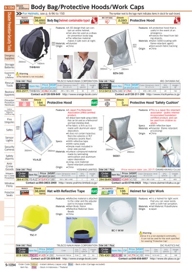 THENUMBERNEXTTOTHELOGOMARKINDICATESITEMSINSTOCKFOREACHBRAND.BC-1W:WTSC-YBACKSTYLEEXAMPLE90001500MM350MM280MMYS-AJZ490MM350MM280MMFORHELMETS,SEEP.6-96TO150BZN-300THHB-NV390MM180MM290MM300MM280MM420MMTRUSCOBODYBAG(HELMETCONTAINABLETYPE)ORDERUNIT:1PIECETRUSCONAKAYAMACORPORATIONORDERCODEITEMNO.PRICE(PERPIECE)MSRP(PERPIECE)OUTERDIMENSION(MM)WXDXHSPQ(PIECE)WEIGHT(G)855-2577THHB-NV¥2,962¥3,200290X180X39020270CONTACTUS:0120-509-849HTTP://WWW.ORANGE-BOOK.COM/TRUSCOHATWITHREFLECTIVETAPEORDERCODEITEMNO.PRICE(PERPIECE)MSRP(PERPIECE)COLORSIZE(CM)SPQ(PIECE)WEIGHT(G)819-1800TSC-Y¥1,435¥1,550FLUORESCENTYELLOWFREE20055CONTACTUS:0120-509-849HTTP://WWW.ORANGE-BOOK.COM/STOCK38,650ITEMSORDERUNIT:1PIECETRUSCONAKAYAMACORPORATIONYOSHINOPROTECTIVEHOODORDERCODEITEMNO.PRICE(PERPIECE)MSRP(PERPIECE)OUTERDIMENSION(MM)WXDXHSPQ(PIECE)WEIGHT(G)384-4170YS-AJZ¥13,414¥13,800350X280X4901420CONTACTUS:050-3803-2900HTTP://WWW.YOSHINO-LIMITED.CO.JP/STOCK184ITEMSORDERUNIT:1PIECEYOSHINOLIMITED.STOCK38,650ITEMSFEATURES●A3DDESIGNTHATCANCON-TAINANENTIREHELMET.●CANALSOBEUSEDASADISAS-TERPREVENTIONBODYBAG.●THEREFLECTIVEMATERIALMAKESITSAFEEVENATNIGHT.MATERIALS●POLYESTERORIGIN●CHINAFEATURES●REFLECTIVEMATERIALISATTACHEDTOTHECOLLARANDTHEADJUSTERPARTTOINCREASEVISIBILITY.MATERIALS●MAINBODY:NYLON●REFLECTIVEMATERIAL:GLASSBEADSORIGIN●CHINAFEATURES●AJAPANFIRERETARDANTASSOCIATION(JFRA)CERTIFIEDPRODUCT.●ADELUXETYPEMADEUSINGAFABRICTHATCANBEUSEDASAFLAME-PROOFANDHEATSHIELDINGSHEET.●THEFABRICISFIRMASITISMADEWITHALUMINUMVAPORDEPOSITION.●ITDOESNOTCONTAINHAZARDOUSFIBERSLIKEASBESTOSORRCF(REFRACTORYCERAMICFIBER).SPECS●WITHREFLECTIVETAPE●WITHNAMEPLATE●SIMPLEMASKINCLUDEDININNERSIDEPOCKETMATERIALS●SURFACE:COMPOUNDMATERIALMADEBYLAMINATINGSEMI-CARBONANDALUMINUMVAPORDEPOSITION●LINING,COREMATERIAL:FLAME-RETARDANTPOLYESTERORIGIN●CHINA●THEHELMETISNOTINCLUDED.WARNINGIRISOHYAMAPROTECTIVEHOODSTOCK2,093ITEMSORDERUNIT:1PIECEIRISOHYAMAINC.ORDERCODEITEMNO.PRICE(PERPIECE)MSRP(PERPIECE)OUTERDIMENSION(MM)WXDXHSPQ(PIECE)WEIGHT(G)512-5413BZN-300¥1,764-300X280X42020160CONTACTUS:0120-211-299HTTP://WWW.IRISOHYAMA.CO.JP/DICPLASTICSHELMETFORLIGHTWORKORDERCODEITEMNO.OPPRICE(PERPIECE)MSRP(PERPIECE)COLORSIZE(CM)SPQ(PIECE)WEIGHT(G)795-4301BC-1WW¥1,774¥2,100WHITE52TO6020180CONTACTUS:048-658-8857HTTP://WWW.DIC-PLAS.CO.JP/STOCK105ITEMSORDERUNIT:1PIECEDICPLASTICSINC.DAIMEIPROTECTIVEHOOD"SAFETYCUSHION"ORDERCODEITEMNO.PRICE(PERPIECE)MSRP(PERPIECE)OUTERDIMENSION(MM)WXDXHSPQ(PIECE)WEIGHT(G)294-564990001¥2,849¥3,150350X280X50040400CONTACTUS:03-5746-0825HTTP://WWW.DAIMEI-KIKAKU.CO.JP/STOCK3ITEMSORDERUNIT:1PIECE(PRICEREVISIONDATE:JAN,2017)DAIMEIKIKAKUCO.LTDFEATURES●APROTECTIVEHOODTHATISUSEFULINTHEEVENTOFANEMERGENCY.●PROTECTSTHEHEADFROMFALL-INGOBJECTS.MATERIALS●NYLON420D(COATINGWITHFLAME-RETARDANTAGENT)●NON-WOVENFABRICBACKINGORIGIN●CHINAFEATURES●ITISAHELMETFORLIGHTWORKTHATYOUCANWEAREASILYWITHACLOTHHATSENSATION.MATERIALS●HATMATERIAL:POLYETHYLENEORIGIN●JAPAN●SINCEITISANON-STANDARDCOMMODITY,ITCANNOTBEUSEDFORTHEWORKSPECIFIEDFORWEARING"PROTECTIVECAP".WARNINGFEATURES●THISISAJAPANFIRERETARDANTASSOCIATION(PUBLICINTERESTINCORPORATEDFOUNDATION)CERTIFIEDPRODUCT,ANDCANBEUSEDFROMCHILDRENTOADULTS.SPECS●WITHREFLECTIVETAPEMATERIALS●POLYESTER(FLAMERETARDANTPROCESSING)ORIGIN●CHINADISASTERPREVENTION・SECURITYTOOLSEMERGENCYSUPPLIESSTORAGEBATTERIESEQUIPMENTSFORLIFELINERESCUETOOLSRESTOREEQUIPMENTSDISASTERPREVENTIONWAREHOUSESSAFETYEQUIPMENTSAGAINSTOVERTURNINGFIREEXTINGUISHERSSAFESSENSORLIGHTSSECURITYCAMERASSAFETYALARMSANTI-CRIMEGOODSWEARSFORCRIMEPREVENTIONWINDOWFILMSPROTECTIONSEALSSTOCK208ITEMSBODYBAG/PROTECTIVEHOODS/WORKCAPS9-1094*0410791*9-1094ORDERCODEYELLOW…INSTANTDELIVERY(JAPANONLY)BLUE…BACKORDER(CARRIAGEEXCLUDED)ITEMNO.PINK…STOCKININDONESIA/THAILAND