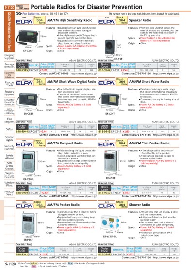 THENUMBERNEXTTOTHELOGOMARKINDICATESITEMSINSTOCKFOREACHBRAND.78MM160MM120MM98MM91MM96MM32MM130MM27MM19MM16MM49MM128MM100MM68MM55MM56MM142MMER-C56FER-19FER-C38FLER-P36FER-N52FER-W30F-BL76MM31MM123MMER-C55T76MM31MM123MMER-C54TFORBATTERIES,SEEP.10-461TO474ELPAAM/FMHIGHSENSITIVITYRADIOORDERCODEITEMNO.PRICE(PERPIECE)MSRP(PERPIECE)WXDXH(MM)SPQ(PIECE)WEIGHT(G)818-9945ER-C56F¥7,838-128X32X7810220CONTACTUS:072-871-1166HTTP://WWW.ELPA.CO.JP/ELPAAM/FMSHORTWAVEDIGITALRADIOORDERCODEITEMNO.PRICE(PERPIECE)MSRP(PERPIECE)WXDXH(MM)SPQ(PIECE)WEIGHT(G)818-9944ER-C55T¥3,441-123X31X7610220CONTACTUS:072-871-1166HTTP://WWW.ELPA.CO.JP/ELPAAM/FMCOMPACTRADIOORDERCODEITEMNO.PRICE(PERPIECE)MSRP(PERPIECE)WXDXH(MM)SPQ(PIECE)WEIGHT(G)818-9939ER-C38FL¥2,839-68X27X12010140CONTACTUS:072-871-1166HTTP://WWW.ELPA.CO.JP/ELPAAM/FMPOCKETRADIOORDERCODEITEMNO.PRICE(PERPIECE)MSRP(PERPIECE)WXDXH(MM)SPQ(PIECE)WEIGHT(G)818-9941ER-P36F¥1,929-55X19X9810100CONTACTUS:072-871-1166HTTP://WWW.ELPA.CO.JP/STOCK364ITEMSSTOCK364ITEMSSTOCK364ITEMSSTOCK364ITEMSORDERUNIT:1PIECEASAHIELECTRICCO.,LTD.ORDERUNIT:1PIECEASAHIELECTRICCO.,LTD.ORDERUNIT:1PIECEASAHIELECTRICCO.,LTD.ORDERUNIT:1PIECEASAHIELECTRICCO.,LTD.FEATURES●EQUIPPEDWITHANAUTOSCANFUNCTIONTHATENABLESAUTOMATICTUNINGOFBROADCASTSTATIONS.●ABACKLIGHT-EQUIPPEDLCDTYPETHATISEASYTOOPERATEEVENINTHEDARK.●EQUIPPEDWITHCONVENIENTTIMEDIS-PLAY,ALARM,ANDSLEEPFUNCTIONS.SPECS●POWERSUPPLY:AAALKALINEDRYBATTERYX2(SOLDSEPARATELY)ORIGIN●CHINAFEATURES●DUETOTHELIQUIDCRYSTALDISPLAY,STA-TIONSELECTIONISEASY.●CAPABLEOFCATCHINGAWIDERANGETHATCOVERSINTERNATIONALBROADCASTSFROMOVERSEASANDDOMESTICAM/FMBROADCASTS.SPECS●POWER:AADRYBATTERYX2(SOLDSEPARATELY)ORIGIN●CHINAFEATURES●WHILEWATCHINGTHELIQUIDCRYSTALDIS-PLAY,STATIONSELECTIONISEASY.●ACLOCK-EQUIPPEDLCDTYPETHATCANBESEENINAGLANCE.●EQUIPPEDWITHALARGE50MMSPEAKERFORCOMFORTABLESOUNDQUALITY.SPECS●POWER:AADRYBATTERYX2(SOLDSEPARATELY)ORIGIN●CHINAFEATURES●APORTABLESIZETHATISIDEALFORTAKINGALONGONATRAVELORWALK.●EQUIPPEDWITHASYNCHRONIZINGLAMPFOREASYSTATIONSELECTION.●EQUIPPEDWITHA40MMSPEAKERTHATISEASYTOLISTENTO.SPECS●POWERSUPPLY:AAADRYBATTERYX2(SOLDSEPARATELY)ORIGIN●CHINAELPASPEAKERRADIOORDERCODEITEMNO.PRICE(PERPIECE)MSRP(PERPIECE)WXDXH(MM)SPQ(PIECE)WEIGHT(G)818-9942ER-19F¥3,564-100X130X1605550CONTACTUS:072-871-1166HTTP://WWW.ELPA.CO.JP/ELPAAM/FMSHORTWAVERADIOORDERCODEITEMNO.PRICE(PERPIECE)MSRP(PERPIECE)WXDXH(MM)SPQ(PIECE)WEIGHT(G)818-9943ER-C54T¥2,685-123X31X7610200CONTACTUS:072-871-1166HTTP://WWW.ELPA.CO.JP/ELPAAM/FMTHINPOCKETRADIOORDERCODEITEMNO.PRICE(PERPIECE)MSRP(PERPIECE)WXDXH(MM)SPQ(PIECE)WEIGHT(G)818-9940ER-N52F¥2,993-56X16X911080CONTACTUS:072-871-1166HTTP://WWW.ELPA.CO.JP/ELPASHOWERRADIOORDERCODEITEMNO.PRICE(PERPIECE)MSRP(PERPIECE)WXDXH(MM)SPQ(PIECE)WEIGHT(G)818-9947ER-W30F-BL¥3,271-142X49X965300CONTACTUS:072-871-1166HTTP://WWW.ELPA.CO.JP/STOCK364ITEMSSTOCK364ITEMSSTOCK364ITEMSSTOCK364ITEMSORDERUNIT:1PIECEASAHIELECTRICCO.,LTD.ORDERUNIT:1PIECEASAHIELECTRICCO.,LTD.ORDERUNIT:1PIECEASAHIELECTRICCO.,LTD.ORDERUNIT:1PIECEASAHIELECTRICCO.,LTD.FEATURES●WITHTHISONEUNITTHATSERVESTHEROLESOFARADIOANDSPEAKER,YOUCANLISTENTOTHERADIOANDALSOLISTENTOTHETVBYYOURSIDE.SPECS●POWERSUPPLY:CSIZEALKALINEDRYBATTERYX4(SOLDSEPARATELY)ORIGIN●CHINAFEATURES●CAPABLEOFCATCHINGAWIDERANGETHATCOVERSINTERNATIONALBROADCASTSFROMOVERSEASANDDOMESTICAM/FMBROADCASTS.●CONVENIENTTOCARRYFORHAVINGAHANDSTRAP.SPECS●POWER:AADRYBATTERYX2(SOLDSEPARATELY)ORIGIN●CHINAFEATURES●ASLIMSHAPEWITHATHICKNESSOF16MMTHATFITSINTHEPOCKET.●ATOPSURFACEDIALTYPEISEASYTOOPERATEINTHEPOCKET.SPECS●POWERSUPPLY:AAADRYBATTERYX2(SOLDSEPARATELY)ORIGIN●CHINAFEATURES●ANLCDTYPETHATCANDISPLAYACLOCKANDTHETEMPERATURE.●ADRIP-PROOFSTRUCTURETHATENABLESUSENEARWATER.●CANBEUSEDUPONBEINGPLACEDSOMEWHEREORWHILEBEINGHUNG.SPECS●POWER:AADRYBATTERYX2(SOLDSEPARATELY)●WATERPROOFPERFORMANCE:IPX4(SPLASHPROOFTYPE)ORIGIN●CHINADISASTERPREVENTION・SECURITYTOOLSEMERGENCYSUPPLIESSTORAGEBATTERIESEQUIPMENTSFORLIFELINERESCUETOOLSRESTOREEQUIPMENTSDISASTERPREVENTIONWAREHOUSESSAFETYEQUIPMENTSAGAINSTOVERTURNINGFIREEXTINGUISHERSSAFESSENSORLIGHTSSECURITYCAMERASSAFETYALARMSANTI-CRIMEGOODSWEARSFORCRIMEPREVENTIONWINDOWFILMSPROTECTIONSEALSSTOCK191ITEMSPORTABLERADIOSFORDISASTERPREVENTION9-1120*0410990*9-1120ORDERCODEYELLOW…INSTANTDELIVERY(JAPANONLY)BLUE…BACKORDER(CARRIAGEEXCLUDED)ITEMNO.PINK…STOCKININDONESIA/THAILAND