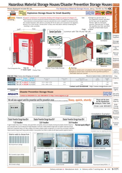 PRICESDISPLAYEDINCLUDE8%TAX.INSTALLEDNEARFIREFIGHTINGFACILITIESBS-K(METALSIDING)BS-A(ALUMINUMSIDING)BS-Y(CERAMICTYPESIDING)EXTERIORWALLSTOCHOOSEFROMWEWILLALSOSUPPORTSEMI-FIREPREVENTIONANDFIREPREVENTIONAREAS(WEWILLCONTACTYOUSEPARATELY)DISASTERPREVENTIONSTORAGEHOUSEBS-A1.5TSUBO2.0TSUBO3.0TSUBO<INSTALLATIONEXAMPLE>DISASTERPREVENTIONSTORAGEHOUSEBS-YDISASTERPREVENTIONSTORAGEHOUSEBS-KEASY,QUICK,STURDYINREGARDTODISASTERSTHATCANOCCURINTHEFUTURE,VARIOUSGOVERNMENTS,MUNICIPALITIES,SCHOOLS,ANDCOMPANIESARETAKINGVARIOUSDISASTERPREVENTIONMEASURESATSUCHASEVACUATIONSITES.ASCANBEUNDERSTOODFROMLARGEEARTHQUAKESINRECENTYEARS,"DISASTERPREVENTIONSTORAGEHOUSES"ARERELIABLEINAREASTHATAREHITANDISOLATEDDUETOTRANSPORTATIONBEINGCUTOFF.WATER,EMERGENCYFOOD,BLANKETS,EMERGENCYSUPPLIES,ANDGENERATORS,ETC.ARESAFEIFTHEYARESTOCKPILEDINNAGAWA'S"DISASTERPREVENTIONSTORAGEHOUSES"HAVINGEXCELLENTDURABILITY.ITISALSOPOSSIBLETOCARRYTHESETOADISASTERSITEWITHDISASTERPREVENTIONEQUIPMENTINSIDEOFIT.SOLARBATTERY-OPERATEDFANCHARACTERENGRAVINGSWITCHSTAINLESSSTEELFD-EQUIPPEDHOODOUTLETSOCKETINSULATIONFORINNERWALLANDCEILINGBREAKERFLUORESCENTLAMP(40WX1)OPTIONFLOORLOADCAPACITY400KG/M2PLEASEASKTHESTOREFORTHEMANUFACTURERCATALOGBY"ORDERCODE".▼ORDERCODE:800-6831TSK-1R(1TSUBOTYPE)DEPTHWIDTHHEIGHT(COMMONWITHTSK-1RANDTSK-2R)STANDARDSPECIFICATIONINDOORCEILINGSTEELDRAINSPOUTINTERIORFLOOR/SIDEGROOVEFIREEXTINGUISHERBOXVENTILATORDOORCLOSERRESERVOIRDISPLAYPLATEFORHAZARDOUSMATERIALSTORAGEHOUSE,SEEP.10-701TO702TRUSCOEXPLOSIVESSTORAGEHOUSEFORSMALLQUANTITYCONSTRUCTIONSETTINGOKLONGCAUTIONHEAVYCAUTIONORDERCODEITEMNO.PRICE(PERPIECE)MSRP(PERPIECE)WXDXH(MM)FLOORAREA(M2)FLOORAREA(TSUBO:APPROX.3.3M)SPQ(PIECE)WEIGHT(KG)★463-0777TSK-1R¥1,428,377¥1,543,0001915X1800X27093.441.041720★463-0785TSK-2R¥1,982,880¥2,142,0003745X1800X27096.742.0411050CONTACTUS:0120-509-849HTTP://WWW.ORANGE-BOOK.COM/NAGAWADISASTERPREVENTIONSTORAGEHOUSECONSTRUCTIONSETTINGOKCONTACTUSNAGAWACO.LTD.:048-648-6113HTTP://WWW.NAGAWA.CO.JP/STOCK38,650ITEMSORDERUNIT:1PIECEFACTORYDIRECTSHIPPINGNOTINCLUDEDTRUSCONAKAYAMACORPORATIONDRAWING.COMFEATURES●SUPPORTCOMPLIANCEOFCOMPANIESDEALINGWITHDANGEROUSGOODSOFCATEGORYIV.●EASYCONSTRUCTIONWITHFACTORY-MANUFACTUREDPRODUCTIONFINISHEDGOODSCARRIEDBYTRUCK,HANGINGDOWNONTHEFOUNDATIONOFPRE-CONSTRUCTIONONSITEANDANCHORINGITISEASYANDCONSTRUCTIONTIMEONSITEISCOMPLETEDINANEXTREMELYSHORTTIME.●FORSTANDARDEQUIPMENT,ADDSOPTIONSBYCONSULTINGWITHTHEFIRESTATION,ANDCORRESPONDSTOTHEREGULATIONS.●SINCEITISAUNITHOUSE,CONSTRUCTIONISEASYANDRELOCATIONWITHOUTBREAKINGTHEBUILDINGISALSOPOSSIBLE.●BESURETOCONDUCTPRIORCONSULTATIONWITHYOURLOCALFIREDEPARTMENT.●DANGEROUSGOODSCLASS4ANDLESSTHANTHESPECIFIEDQUANTITYOFFLAMMABLELIQUIDARECOVERED.WARNINGUSE●DANGEROUSGOODSCLASS4,FIREHAZARDOUSLIQUIDSSPECIFIEDBYFIRELAWSUCHASGASOLINE,THINNER,LIGHTOIL,KEROSENE,ALCOHOL,LUBRICANTETC/TOKEEPTHEQUANTITYLESSTHANSPECIFIEDQUANTITYOFFLAMMABLELIQUID.ORIGIN●JAPANDISASTERPREVENTION・SECURITYTOOLSEMERGENCYSUPPLIESSTORAGEBATTERIESEQUIPMENTSFORLIFELINERESCUETOOLSRESTOREEQUIPMENTSDISASTERPREVENTIONWAREHOUSESSAFETYEQUIPMENTSAGAINSTOVERTURNINGFIREEXTINGUISHERSSAFESSENSORLIGHTSSECURITYCAMERASSAFETYALARMSANTI-CRIMEGOODSWEARSFORCRIMEPREVENTIONWINDOWFILMSPROTECTIONSEALSHAZARDOUSMATERIALSTORAGEHOUSES/DISASTERPREVENTIONSTORAGEHOUSES9-1171*0411350*9-1171DELIVERYESTIMATE★…MANUFACTURERSTOCK★…DELIVERYWITHIN7WORKINGDAYS★…ASK