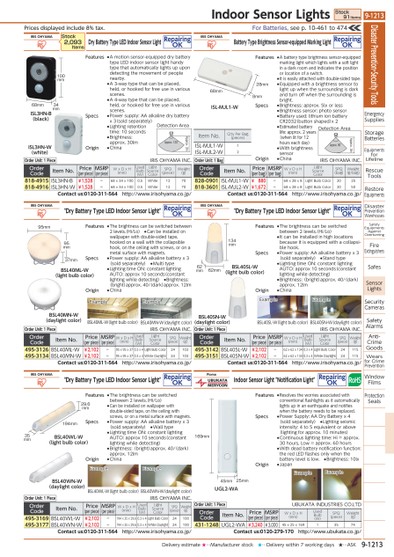 PRICESDISPLAYEDINCLUDE8%TAX.ISL3HN-W(WHITE)ISL3HN-B(BLACK)100MM68MM34MMDETECTIONAREAAPPROX.3MAPPROX.130°28MMISL-MJL1-W68MM8MMDETECTIONAREAAPPROX.3MAPPROX.90°BSL40SN-W(DAYLIGHTCOLOR)BSL40SL-W(LIGHTBULBCOLOR)EXAMPLEBSL40SN-W(DAYLIGHTCOLOR)EXAMPLE134MMBSL40SL-W(LIGHTBULBCOLOR)62MM62MMBSL40MN-W(DAYLIGHTCOLOR)BSL40MN-W(DAYLIGHTCOLOR)EXAMPLEEXAMPLEBSL40ML-W(LIGHTBULBCOLOR)BSL40ML-W(LIGHTBULBCOLOR)95MM37MM95MMBSL40WN-W(DAYLIGHTCOLOR)BSL40WL-W(LIGHTBULBCOLOR)194MM35MM29.6MMBSL40WN-W(DAYLIGHTCOLOR)BSL40WL-W(LIGHTBULBCOLOR)EXAMPLEEXAMPLEUGL2-WA169MM45MM25MMEXAMPLEEXAMPLEITEMNO.Q'TYPERBAG(PIECES)ISL-MJL1-W1ISL-MJL2-W2FORBATTERIES,SEEP.10-461TO474IRISOHYAMADRYBATTERYTYPELEDINDOORSENSORLIGHTREPAIRINGOKORDERCODEITEMNO.PRICE(PERPIECE)MSRP(PERPIECE)WXDXH(MM)USEDBULB(W)LIGHTSOURCECOLORSPQ(PIECE)WEIGHT(G)818-4915ISL3HN-B¥1,528-68X34X1000.5WHITE1270818-4916ISL3HN-W¥1,528-68X34X1000.5WHITE1270CONTACTUS:0120-311-564HTTP://WWW.IRISOHYAMA.CO.JP/ORDERUNIT:1PIECEIRISOHYAMAINC.IRISOHYAMA"DRYBATTERYTYPELEDINDOORSENSORLIGHT"REPAIRINGOKORDERCODEITEMNO.PRICE(PERPIECE)MSRP(PERPIECE)WXDXH(MM)USEDBULB(W)LIGHTSOURCECOLORSPQ(PIECE)WEIGHT(G)495-3126BSL40ML-W¥2,102-95X95X370.3X4LIGHTBULBCOLOR24103495-3134BSL40MN-W¥2,102-95X95X370.3X4WHITEDAYLIGHT24103CONTACTUS:0120-311-564HTTP://WWW.IRISOHYAMA.CO.JP/ORDERUNIT:1PIECEIRISOHYAMAINC.IRISOHYAMA"DRYBATTERYTYPELEDINDOORSENSORLIGHT"REPAIRINGOKORDERCODEITEMNO.PRICE(PERPIECE)MSRP(PERPIECE)WXDXH(MM)USEDBULB(W)LIGHTSOURCECOLORSPQ(PIECE)WEIGHT(G)495-3169BSL40WL-W¥2,102-194X35X29.60.3X4LIGHTBULBCOLOR24100495-3177BSL40WN-W¥2,102-194X35X29.60.3X4WHITEDAYLIGHT24100CONTACTUS:0120-311-564HTTP://WWW.IRISOHYAMA.CO.JP/ORDERUNIT:1PIECEIRISOHYAMAINC.STOCK2,093ITEMSFEATURES●AMOTIONSENSOR-EQUIPPEDDRYBATTERYTYPELEDINDOORSENSORLIGHTHANDYTYPETHATAUTOMATICALLYLIGHTSUPUPONDETECTINGTHEMOVEMENTOFPEOPLENEARBY.●A3-WAYTYPETHATCANBEPLACED,HELD,ORHOOKEDFORFREEUSEINVARIOUSSCENES.●A4-WAYTYPETHATCANBEPLACED,HELD,ORHOOKEDFORFREEUSEINVARIOUSSCENES.SPECS●POWERSUPPLY:AAALKALINEDRYBATTERYX3(SOLDSEPARATELY)●LIGHTINGRETENTIONTIME:10SECONDS●BRIGHTNESS:APPROX.30LMORIGIN●CHINAFEATURES●THEBRIGHTNESSCANBESWITCHEDBETWEEN2LEVELS.(HI/LO)●CANBEINSTALLEDONWALLPAPERWITHDOUBLE-SIDEDTAPE,HOOKEDONAWALLWITHTHECOLLAPSIBLEHOOK,ONTHECEILINGWITHSCREWS,ORONAMETALSURFACEWITHMAGNETS.SPECS●POWERSUPPLY:AAALKALINEBATTERYX3(SOLDSEPARATELY)●MULTITYPE●LIGHTINGTIMEON:CONSTANTLIGHTINGAUTO:APPROX10SECONDS(CONSTANTLIGHTINGWHILEDETECTING)●BRIGHTNESS:(BRIGHT)APPROX.40/(DARK)APPROX.12LMORIGIN●CHINAFEATURES●THEBRIGHTNESSCANBESWITCHEDBETWEEN2LEVELS.(HI/LO)●CANBEINSTALLEDONWALLPAPERWITHDOUBLE-SIDEDTAPE,ONTHECEILINGWITHSCREWS,ORONAMETALSURFACEWITHMAGNETS.SPECS●POWERSUPPLY:AAALKALINEBATTERYX3(SOLDSEPARATELY)●WALLTYPE●LIGHTINGTIMEON:CONSTANTLIGHTINGAUTO:APPROX10SECONDS(CONSTANTLIGHTINGWHILEDETECTING)●BRIGHTNESS:(BRIGHT)APPROX.40/(DARK)APPROX.12LMORIGIN●CHINAIRISOHYAMABATTERYTYPEBRIGHTNESSSENSOR-EQUIPPEDMARKINGLIGHTREPAIRINGOKORDERUNIT:1BAGIRISOHYAMAINC.ORDERCODEITEMNO.PRICE(PERBAG)MSRP(PERBAG)WXDXH(MM)LIGHTSOURCECOLORSPQ(BAG)WEIGHT(G/BAG)828-0901ISL-MJL1-W¥880-68X28X8LIGHTBULBCOLOR2025818-3601ISL-MJL2-W¥1,672-68X28X8LIGHTBULBCOLOR2050CONTACTUS:0120-311-564HTTP://WWW.IRISOHYAMA.CO.JP/IRISOHYAMA"DRYBATTERYTYPELEDINDOORSENSORLIGHT"REPAIRINGOKORDERCODEITEMNO.PRICE(PERPIECE)MSRP(PERPIECE)WXDXH(MM)USEDBULB(W)LIGHTSOURCECOLORSPQ(PIECE)WEIGHT(G)495-3142BSL40SL-W¥2,102-62X62X1340.3X4LIGHTBULBCOLOR24115495-3151BSL40SN-W¥2,102-62X62X1340.3X4WHITEDAYLIGHT24115CONTACTUS:0120-311-564HTTP://WWW.IRISOHYAMA.CO.JP/ORDERUNIT:1PIECEIRISOHYAMAINC.PIOMAINDOORSENSORLIGHT"NOTIFICATIONLIGHT"REPAIRINGOKORDERCODEITEMNO.PRICE(PERPIECE)MSRP(PERPIECE)WXDXH(MM)USEDBULB(W)SPQ(PIECE)WEIGHT(G)431-1248UGL2-WA¥3,240¥3,00045X25X16913574CONTACTUS:0120-279-170HTTP://WWW.UBUKATA.CO.JP/ORDERUNIT:1PIECEUBUKATAINDUSTRIESCO.LTDFEATURES●ABATTERYTYPEBRIGHTNESSSENSOR-EQUIPPEDMARKINGLIGHTWHICHLIGHTSWITHASOFTLIGHTINADARKROOMANDINDICATESTHEPOSITIONORLOCATIONOFASWITCH.●ITISEASILYATTACHEDWITHDOUBLE-SIDEDTAPE.●EQUIPPEDWITHABRIGHTNESSSENSORTOLIGHTUPWHENTHESURROUNDINGISDARKANDTURNOFFWHENTHESURROUNDINGISBRIGHT.SPECS●BRIGHTNESS:APPROX.5LXORLESS●BRIGHTNESSSENSOR:PHOTOSENSOR●BATTERYUSED:LITHIUMIONBATTERYCR2032(BUTTONSHAPED)X2●ESTIMATEDBATTERYLIFE:APPROX.2YEARS(WHENLITFOR12HOURSEACHDAY)●WITHBRIGHTNESSSENSORORIGIN●CHINAFEATURES●THEBRIGHTNESSCANBESWITCHEDBETWEEN2LEVELS.(HI/LO)●ITCANBEINSTALLEDINHIGHLOCATIONSBECAUSEITISEQUIPPEDWITHACOLLAPSI-BLEHOOK.SPECS●POWERSUPPLY:AAALKALINEBATTERYX3(SOLDSEPARATELY)●STANDTYPE●LIGHTINGTIMEON:CONSTANTLIGHTINGAUTO:APPROX10SECONDS(CONSTANTLIGHTINGWHILEDETECTING)●BRIGHTNESS:(BRIGHT)APPROX.40/(DARK)APPROX.12LMORIGIN●CHINAFEATURES●RESOLVESTHEWORRIESASSOCIATEDWITHCONVENTIONALFLASHLIGHTSASITAUTOMATICALLYLIGHTSUPINANEARTHQUAKEANDNOTIFIESWHENTHEBATTERYNEEDSTOBEREPLACED.SPECS●POWERSUPPLY:AADRYBATTERYX4(SOLDSEPARATELY)●LIGHTINGSEISMICINTENSITY:4TO5EQUIVALENTORABOVE(LIGHTINGFORAPPROX.10MINUTES)●CONTINUOUSLIGHTINGTIME:HI=APPROX.30HOURS,LOW=APPROX.60HOURS●WITHDEADBATTERYNOTIFICATIONFUNCTION:THEREDLEDFLASHESONLYWHENTHEBATTERYLEVELISLOW.●BRIGHTNESS:10LXORIGIN●JAPANDISASTERPREVENTION・SECURITYTOOLSEMERGENCYSUPPLIESSTORAGEBATTERIESEQUIPMENTSFORLIFELINERESCUETOOLSRESTOREEQUIPMENTSDISASTERPREVENTIONWAREHOUSESSAFETYEQUIPMENTSAGAINSTOVERTURNINGFIREEXTINGUISHERSSAFESSENSORLIGHTSSECURITYCAMERASSAFETYALARMSANTI-CRIMEGOODSWEARSFORCRIMEPREVENTIONWINDOWFILMSPROTECTIONSEALSINDOORSENSORLIGHTSSTOCK91ITEMS9-1213*0411763*9-1213DELIVERYESTIMATE★…MANUFACTURERSTOCK★…DELIVERYWITHIN7WORKINGDAYS★…ASK