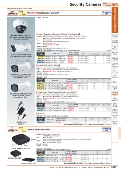 PRICESDISPLAYEDINCLUDE8%TAX.DHI-HCVR4104C-S32TB-1HEIGHTWIDTHDEPTHDH-HAC-HFW1100SP-0280B(1MWATERPROOFTYPECAMERA)DH-HAC-HFW2221RN-Z-IRE6(WATERPROOFTYPECAMERA(INFRAREDRAYS60M))CA095-R3-PSE(ADAPTER)DHI-HCVR7104C-S32TB-1DH-HAC-HDBW1220RN-VF(2MIMPACTRESISTANTWATERPROOFDOMETYPECAMERA)DH-HAC-HFW1220RN-VF-IRE6(WATERPROOFTYPECAMERA(INFRAREDRAYS60M))DEPTHWIDTHHEIGHTDHI-HCVR7108HE-S22TB-1DAHUA"IR(INFRARED)WATERPROOFCAMERA"REPAIRINGOKDAHUA"TRIBRIDSMARTRECORDER"REPAIRINGOKORDERCODEITEMNO.PRICE(PERPIECE)MSRP(PERPIECE)WXDXH(MM)SPQ(PIECE)WEIGHT(KG)836-9321DHI-HCVR4104C-S32TB-1¥82,080-205X205X4011.3★819-3345DHI-HCVR4108HE-S22TB-1¥106,380-325X255X5512.3★836-9322DHI-HCVR7104C-S32TB-1¥115,830-205X205X4011.3★819-3347DHI-HCVR7108HE-S22TB-1¥174,960-325X255X5512.3CONTACTUS:072-648-7526HTTP://WWW.MITSUBOSHIDIAMOND.COM/ORDERCODEITEMNO.PRICE(PERPIECE)MSRP(PERPIECE)WXDXH(MM)MAXNUMBEROFPIXELS(TENTHOUSAND)SPQ(PIECE)WEIGHT(KG)859-0834DH-HAC-HFW1100RN-VF-S3¥30,510¥45,20090.4X213X90.410010.55819-3338DH-HAC-HFW1100RP-VF¥30,510-80.0X213X72.010010.55819-3339DH-HAC-HFW1100SN-0280B¥18,630-65.0X65X154.710010.38819-3340DH-HAC-HFW1100SP-0280B¥18,630-65.0X65X154.710010.38ORDERCODEITEMNO.PRICE(PERPIECE)MSRP(PERPIECE)WXDXH(MM)MAXNUMBEROFPIXELS(TENTHOUSAND)SPQ(PIECE)WEIGHT(KG)819-3333DH-HAC-HDBW1100RP-VF¥30,510-122X122X89.010010.45859-0831DH-HAC-HDBW1100RN-VF-S3¥30,510-122X122X88.910010.40★859-0832DH-HAC-HDBW1220RN-VF¥35,546-122X122X88.920010.40★859-0833DH-HAC-HDBW2221RN-Z¥54,270-122X122X88.921010.40STOCK7ITEMSSTOCK7ITEMSORDERUNIT:1PIECEFACTORYDIRECTFREIGHT:¥1,000EXCLUDINGREMOTEISLANDSORDERCODEITEMNO.PRICE(PERPIECE)MSRP(PERPIECE)WXDXH(MM)MAXNUMBEROFPIXELS(TENTHOUSAND)SPQ(PIECE)WEIGHT(KG)★859-0835DH-HAC-HFW1220RN-VF-IRE6¥35,640-90.4X213X90.420010.55★836-9319DH-HAC-HFW2221RN-Z-IRE6¥54,270-80.0X213X72.021010.55ORDERUNIT:1PIECEFACTORYDIRECTSHIPPINGNOTINCLUDEDORDERCODEITEMNO.PRICE(PERPIECE)MSRP(PERPIECE)WXDXH(MM)SPQ(PIECE)WEIGHT(KG)★836-9320CA095-R3-PSE¥3,240-41X84X2610.15CONTACTUS:072-648-7526HTTP://WWW.MITSUBOSHIDIAMOND.COM/ORDERUNIT:1PIECEBLUEFACTORYDIRECTFREIGHT:¥1,000EXCLUDINGREMOTEISLANDSDAHUAORDERUNIT:1PIECEORDERUNIT:1PIECEBLUEFACTORYDIRECTNOFREIGHTCHARGEDAHUAORIGIN●CHINAIMPACTRESISTANTWATERPROOFDOMETYPECAMERAWATERPROOFTYPECAMERAFEATURES●ACOMPACTSIZERECORDER.●HDD2TBLOADEDMODEL.USE●FORSECURITY.●FORSECURITYVIDEORECORDINGANDREMOTEMONITORINGOFSECURITYCAMERAS.SPECS●TRIBRID(ANALOG/HD-CVI/IP)●HDD2TBMOUNTED/1SATAMATERIALS●STEELORIGIN●CHINAFEATURES●ANIMPACTRESISTANTWATERPROOFDOMETYPECAMERAWITHINFRARED.●AUTOMATICFOCUSADJUSTMENTISPOSSIBLEWITHTHEMOTORIZEDLENS.USE●FORSECURITY.●PREVENTIONOFCRIME,THREATSANDSOON.SPECS●INFRAREDRAYS30M●PROTECTIONGRADE:IP67MATERIALS●STEELSETCONTENTS●HEXAGONALWRENCH,MOUNTINGSCREWFEATURES●AWATERPROOFBULLETTYPECAMERAWITHINFRAREDRAYS.USE●FORSECURITY.●PREVENTIONOFCRIME,THREATSANDSOON.SPECS●INFRAREDRAYS30M●PROTECTIONGRADE:IP67MATERIALS●STEELSETCONTENTS●HEXAGONALWRENCH,MOUNTINGSCREWWATERPROOFTYPECAMERA(INFRAREDRAYS60M)ADAPTERFEATURES●AWATERPROOFBULLETTYPECAMERAWITHINFRAREDRAYS.USE●FORSECURITY.●PREVENTIONOFCRIME,THREATSANDSOON.SPECS●INFRAREDRAYS60M●PROTECTIONGRADE:IP67MATERIALS●STEELDISASTERPREVENTION・SECURITYTOOLSEMERGENCYSUPPLIESSTORAGEBATTERIESEQUIPMENTSFORLIFELINERESCUETOOLSRESTOREEQUIPMENTSDISASTERPREVENTIONWAREHOUSESSAFETYEQUIPMENTSAGAINSTOVERTURNINGFIREEXTINGUISHERSSAFESSENSORLIGHTSSECURITYCAMERASSAFETYALARMSANTI-CRIMEGOODSWEARSFORCRIMEPREVENTIONWINDOWFILMSPROTECTIONSEALSSECURITYCAMERASSTOCK20ITEMS9-1221*0411850*9-1221DELIVERYESTIMATE★…MANUFACTURERSTOCK★…DELIVERYWITHIN7WORKINGDAYS★…ASK
