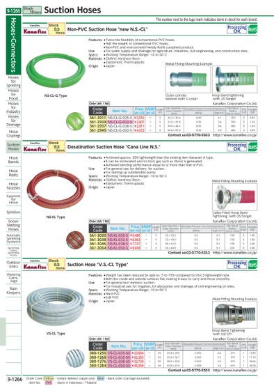 THENUMBERNEXTTOTHELOGOMARKINDICATESITEMSINSTOCKFOREACHBRAND.NS-CL-GTYPEVS-CLTYPENS-KLTYPEVALLEY-FILLEDHOOPBANDTIGHTENING(WITHJISFLANGE)HOOPBANDTIGHTENING(WITHOZ-CP)OUTERCYLINDERFASTENER(WITHSCOLLAR)HOOPBANDTIGHTENING(WITHJISFLANGE)METALFITTINGMOUNTINGEXAMPLEMETALFITTINGMOUNTINGEXAMPLEMETALFITTINGMOUNTINGEXAMPLEKANAFLEXNON-PVCSUCTIONHOSE"NEWN.S.-CL"PROCESSINGOKORDERCODEITEMNO.PRICE(PERROLL)MSRP(PERROLL)LENGTH(M)INNERDIAMETERXOUTERDIAMETER(MM)ALLOWABLEPRESSURE(NORMALTEMPERATURE)MINBENDRADIUS(MMORMORE)SPQ(ROLL)WEIGHT(KG)(MPA)(KGF/CM2)361-2911NS-CL-G-025-5¥2,516-526.2X30.40.404.125050.85361-2929NS-CL-G-032-5¥2,607-533.5X37.80.353.635051.20361-2937NS-CL-G-038-5¥2,811-539.5X44.50.353.640051.65361-2945NS-CL-G-050-5¥4,022-550.8X57.00.252.545052.40CONTACTUS:03-5770-5553HTTP://WWW.KANAFLEX.CO.JP/KANAFLEXDESALINATIONSUCTIONHOSE"CANALINEN.S."PROCESSINGOKORDERCODEITEMNO.PRICE(PERROLL)MSRP(PERROLL)LENGTH(M)INNERDIAMETERXOUTERDIAMETER(MM)ALLOWABLEPRESSURE(NORMALTEMPERATURE)MINBENDRADIUS(MMORMORE)SPQ(ROLL)WEIGHT(KG)(MPA)(KGF/CM2)361-3020NS-KL-025-5¥5,480-525X35.50.55.110551.45361-3038NS-KL-032-5¥6,063-532X43.00.55.112051.90361-3046NS-KL-038-5¥7,747-540X51.00.55.115052.40361-3054NS-KL-050-5¥9,608-550X63.00.55.122553.40CONTACTUS:03-5770-5553HTTP://WWW.KANAFLEX.CO.JP/KANAFLEXSUCTIONHOSE"V.S.-CLTYPE"PROCESSINGOKORDERCODEITEMNO.PRICE(PERROLL)MSRP(PERROLL)LENGTH(M)INNERDIAMETERXOUTERDIAMETER(MM)ALLOWABLEPRESSURE(NORMALTEMPERATURE)MINBENDRADIUS(MMORMORE)SPQ(ROLL)WEIGHT(KG)(MPA)(KGF/CM2380-1250VS-CL-025-50¥23,804-5025.4X29.60.3924.0275112.85380-1268VS-CL-032-50¥26,355-5032.0X36.70.3433.5375117.10380-1276VS-CL-038-50¥32,738-5038.0X42.80.3433.5475120.65380-1284VS-CL-050-50¥46,068-5050.8X57.00.2943.0610135.00CONTACTUS:03-5770-5553HTTP://WWW.KANAFLEX.CO.JP/STOCK53ITEMSSTOCK53ITEMSSTOCK53ITEMSORDERUNIT:1ROLLKANAFLEXCORPORATIONCO.LTD.ORDERUNIT:1ROLLKANAFLEXCORPORATIONCO.LTD.ORDERUNIT:1ROLLKANAFLEXCORPORATIONCO.LTD.FEATURES●TWICETHEFLEXIBILITYOFCONVENTIONALPVCHOSES.●HALFTHEWEIGHTOFCONVENTIONALPVCHOSES.●NON-PVCANDENVIRONMENTFRIENDLYROHSCOMPLIANTPRODUCT.USE●FORWATERSUPPLYANDDRAINAGEFORAGRICULTURE,INDUSTRIES,CIVILENGINEERING,ANDCONSTRUCTIONSITES.SPECS●WORKINGTEMPERATURERANGE:-10TO50°CMATERIALS●OLEFINICHARDNESSRESIN●ELASTOMERICTHERMOPLASTICORIGIN●JAPANFEATURES●ACHIEVEDAPPROX.30%LIGHTWEIGHTTHANTHEEXISTINGITEMKANARAINATYPE.●ITCANBEINCINERATEDANDNOTOXICGASSUCHASDIOXINISGENERATED.●ACHIEVEDBENDINGPERFORMANCEEQUALTOORMORETHANTHATOFPVC.USE●FORGENERALUSE,FORDELIVERY,FORSUCTION.●FORSTARTINGUPSUBMERSIBLEPUMP.SPECS●WORKINGTEMPERATURERANGE:-10TO50°CMATERIALS●OLEFINICHARDNESSRESIN●ELASTOMERICTHERMOPLASTICORIGIN●JAPANFEATURES●WEIGHTHASBEENREDUCEDBYAPPROX.5TO15%COMPAREDTOVS-C3LIGHTWEIGHTTYPE.●BOTHTHEINSIDEANDOUTSIDESURFACESFLAT,MAKINGITEASYTOCARRYANDMOVESMOOTHLY.USE●FORGENERALBURRDELIVERY,SUCTION.●FORINDUSTRIALUSE,FORIRRIGATION,FORABSORPTIONANDDRAINAGEOFCIVILENGINEERINGONSITES.SPECS●WORKINGTEMPERATURERANGE:-10TO50°CMATERIALS●HARDPVC●SOFTPVCORIGIN●JAPANHOSES・CONNECTORSHOSESFORSPRINKLINGHOSESFORFOODHOSESFORINDUSTRYHOSESFORDRAINAGEHOSECOUPLINGSSUCTIONHOSESHOSEBANDSHOSEREELSHOSENOZZLESEQUIPMENTSFORHOSESPRINKLERSSNOW-MELTINGHOSESAUTOMATICSPRINKLINGSYSTEMSSPRINKLINGTUBES,SPRINKLINGHOSESOUTDOORSINKSWATERINGCANS,JUGSRAINKEEPERSSTOCK16ITEMSSUCTIONHOSES9-1266*0523420*9-1266ORDERCODEYELLOW…INSTANTDELIVERY(JAPANONLY)BLUE…BACKORDER(CARRIAGEEXCLUDED)ITEMNO.PINK…STOCKININDONESIA/THAILAND