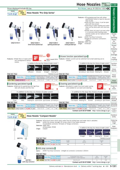 PRICESDISPLAYEDINCLUDE8%TAX.INADDITIONTOTHESTOP,FOURCHOICESOFWATERCURRENTSPOTWATERINGCANSPOTSHOWERWATERINGPOTSHOWERINADDITIONTOTHESTOP,FOURCHOICESOFWATERCURRENTDIFFUSIONSHOWERSTRAIGHTWATERINGPOTINADDITIONTOTHESTOP,SIXCHOICESOFWATERCURRENTFLOWMISTWATERINGPOTSPOTWATERINGCANSPOTSHOWERHIGHFLOWRATESHOWERINADDITIONTOTHESTOP,FIVECHOICESOFWATERCURRENTFAN-SHAPEDWATERINGPOTSHOWERSPOTWATERINGCANSPOTSHOWERGNZ101N11GNZ102N11(SHOWERFUNCTIONSPECIALIZEDTYPE)GNZ103N11(GARDENINGSPECIALIZEDTYPE)GNZ104N11(CLEANINGSPECIALIZEDTYPE)220MMINADDITIONTOTHESTOP,FOURCHOICESOFWATERCURRENTSTRAIGHTMISTWATERINGPOTSHOWERG573FJ(WITHSTOPCONNECTOR)G571FJ160MMFORHOSES,SEEP.9-1252TO1253TAKAGIHOSENOZZLE"PROGRIPSERIES"STOCK268ITEMSORDERUNIT:1PIECETAKAGICO.LTDORDERCODEITEMNO.PRICE(PERPIECE)MSRP(PERPIECE)COMPATIBLEHOSE(MM)INNERDIAMETERXOUTERDIAMETERHEIGHT(MM)SPQ(PIECE)WEIGHT(G)439-7801GNZ101N11¥1,873¥2,12012TO15X2122010353TAKAGIHOSENOZZLE"COMPACTNOZZLE"STOCK268ITEMSORDERUNIT:1PIECETAKAGICO.LTDORDERCODEITEMNO.PRICE(PERPIECE)MSRP(PERPIECE)HEIGHT(MM)SPQ(PIECE)WEIGHT(G)381-4238G571FJ¥1,821¥1,7701605155ORDERUNIT:1PIECEORDERCODEITEMNO.PRICE(PERPIECE)MSRP(PERPIECE)COMPATIBLEHOSE(MM)INNERDIAMETERXOUTERDIAMETERHEIGHT(MM)SPQ(PIECE)WEIGHT(G)439-7827GNZ103N11¥2,085¥2,36012TO15X2122010368ORDERUNIT:1PIECECONTACTUS:0120-37-5580HTTP://WWW.TAKAGI.CO.JP/ORDERCODEITEMNO.PRICE(PERPIECE)MSRP(PERPIECE)COMPATIBLEHOSE(MM)INNERDIAMETERXOUTERDIAMETERSPQ(PIECE)WEIGHT(G)381-4246G573FJ¥2,058¥2,00012TO15X215170FEATURES●THEGRIPPINGPARTHASSOFTRUBBERSPECIFICATIONWHICHISHARDTOSLIPANDEASYTOGRIP.●WITHTHESLIMVLEVER,ITCANBEOPER-ATEDWITHLESSPOWER.●SWITCHINGOFWATERFEEDINGANDWATERSTOPCANBEDONEWITHONECLICK(ONEPUSH).●WATERDOESNOTSQUIRTOUTEVENWHENITISREMOVEDWHILEFEEDINGWATER,ANDTHENOZZLECANBEREPLACEDWITHONETOUCH.SPECS●WITHTOPSTOPCONNECTOR●HEIGHTATCONNECTORCONNECTION:268MMMATERIALS●ABSRESINORIGIN●VIETNAMFEATURES●OPTIMUMFORGARDENINGWITHHIGHFLOWRATESOFTSHOWERANDFINEMIST.GARDENINGSPECIALIZEDTYPEFEATURES●ONE-TOUCHLEVERWHICHSTOPSWATERFLOWBYPULLINGLEVERANDWATERSTOPISADOPTED.SPECS●WITHTHESHOWERSTRENGTHUPSCREENWHENINLOWWATERPRESSURE●COMPATIBLECONNECTOR:ALLTYPESOFTAKAGICONNECTORSMATERIALS●ABSRESIN●POLYACETATE(POM)ORIGIN●JAPANFEATURES●WATERFLOWIS4TYPESANDITCANCORRESPONDTOVARIOUSSCENES.ORDERUNIT:1PIECEORDERCODEITEMNO.PRICE(PERPIECE)MSRP(PERPIECE)COMPATIBLEHOSE(MM)INNERDIAMETERXOUTERDIAMETERHEIGHT(MM)SPQ(PIECE)WEIGHT(G)439-7835GNZ104N11¥2,085¥2,36012TO15X2122010345CONTACTUS:0120-37-5580HTTP://WWW.TAKAGI.CO.JP/ORDERUNIT:1PIECEORDERCODEITEMNO.PRICE(PERPIECE)MSRP(PERPIECE)COMPATIBLEHOSE(MM)INNERDIAMETERXOUTERDIAMETERHEIGHT(MM)SPQ(PIECE)WEIGHT(G)439-7819GNZ102N11¥1,873¥2,12012TO15X2122010322WITHSTOPCONNECTORSPECS●WITHTOPSTOPCONNECTOR●HEIGHTATCONNECTORCONNECTION:205MMCLEANINGSPECIALIZEDTYPEFEATURES●EXCELLENTINWATERFORCEANDWATERSAVING,ANDSUITABLEFORCARWASHANDCLEANING.SHOWERFUNCTIONSPECIALIZEDTYPEFEATURES●WATERCURRENTCANBESWITCHEDFROMSMALLWATERINGCANTOSHOWER.HOSES・CONNECTORSHOSESFORSPRINKLINGHOSESFORFOODHOSESFORINDUSTRYHOSESFORDRAINAGEHOSECOUPLINGSSUCTIONHOSESHOSEBANDSHOSEREELSHOSENOZZLESEQUIPMENTSFORHOSESPRINKLERSSNOW-MELTINGHOSESAUTOMATICSPRINKLINGSYSTEMSSPRINKLINGTUBES,SPRINKLINGHOSESOUTDOORSINKSWATERINGCANS,JUGSRAINKEEPERSHOSENOZZLESSTOCK65ITEMS9-1301*0523660*9-1301DELIVERYESTIMATE★…MANUFACTURERSTOCK★…DELIVERYWITHIN7WORKINGDAYS★…ASK