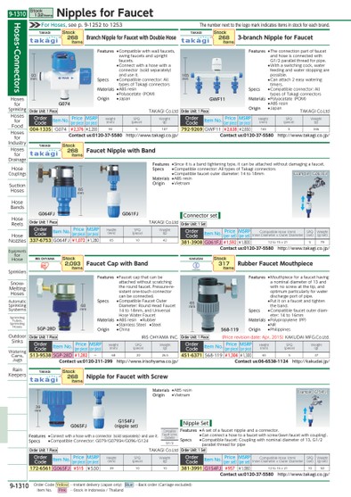 THENUMBERNEXTTOTHELOGOMARKINDICATESITEMSINSTOCKFOREACHBRAND.65MM568-11968MMSGP-28D93MM165MMG074GWF1165MMG064FJG061FJCOMPATIBLEFAUCETSCREWDIAMETERG1/239MMG065FJG154FJ(NIPPLESET)EXAMPLE(G061FJ)EXAMPLE(G154FJ)FORHOSES,SEEP.9-1252TO1253TAKAGIFAUCETNIPPLEWITHBANDSTOCK268ITEMSORDERUNIT:1PIECETAKAGICO.LTDORDERCODEITEMNO.PRICE(PERPIECE)MSRP(PERPIECE)HEIGHT(MM)SPQ(PIECE)WEIGHT(G)337-6753G064FJ¥1,072¥1,280651042TAKAGINIPPLEFORFAUCETWITHSCREWSTOCK268ITEMSORDERUNIT:1PIECETAKAGICO.LTDORDERCODEITEMNO.PRICE(PERPIECE)MSRP(PERPIECE)HEIGHT(MM)SPQ(PIECE)WEIGHT(G)172-6561G065FJ¥515¥530391010IRISOHYAMAFAUCETCAPWITHBANDORDERCODEITEMNO.PRICE(PERPIECE)MSRP(PERPIECE)HEIGHT(MM)SPQ(PIECE)WEIGHT(G)513-9538SGP-28D¥1,282-682026.5CONTACTUS:0120-211-299HTTP://WWW.IRISOHYAMA.CO.JP/STOCK2,093ITEMSORDERUNIT:1PIECEIRISOHYAMAINC.TAKAGIBRANCHNIPPLEFORFAUCETWITHDOUBLEHOSEORDERCODEITEMNO.PRICE(PERPIECE)MSRP(PERPIECE)HEIGHT(MM)SPQ(PIECE)WEIGHT(G)004-1335G074¥2,376¥2,200935107CONTACTUS:0120-37-5580HTTP://WWW.TAKAGI.CO.JP/STOCK268ITEMSORDERUNIT:1PIECETAKAGICO.LTDFEATURES●SINCEITISABANDTIGHTENINGTYPE,ITCANBEATTACHEDWITHOUTDAMAGINGAFAUCET.SPECS●COMPATIBLECONNECTOR:ALLTYPESOFTAKAGICONNECTORS●COMPATIBLEFAUCETOUTERDIAMETER:14TO18MMMATERIALS●ABSRESINORIGIN●VIETNAMMATERIALS●ABSRESINORIGIN●VIETNAMFEATURES●CONNECTWITHAHOSEWITHACONNECTOR(SOLDSEPARATELY)ANDUSEIT.SPECS●COMPATIBLECONNECTOR:G079/G079SH/G096/G124FEATURES●FAUCETCAPTHATCANBEATTACHEDWITHOUTSCRATCHINGTHEROUNDFAUCET.PRESSURE-RE-SISTANTONE-TOUCHCONNECTORCANBECONNECTED.SPECS●COMPATIBLEFAUCETOUTERDIAMETER:ROUNDHEADFAUCET14TO18MM,ANDUNIVERSALHOSEWATERFAUCETMATERIALS●ABSRESIN●RUBBER●STAINLESSSTEEL●STEELORIGIN●CHINAFEATURES●COMPATIBLEWITHWALLFAUCETS,SWINGFAUCETSANDUPRIGHTFAUCETS.●CONNECTWITHAHOSEWITHACONNECTOR(SOLDSEPARATELY)ANDUSEIT.SPECS●COMPATIBLECONNECTOR:ALLTYPESOFTAKAGICONNECTORSMATERIALS●ABSRESIN●POLYACETATE(POM)ORIGIN●JAPANORDERUNIT:1SETORDERCODEITEMNO.PRICE(PERSET)MSRP(PERSET)COMPATIBLEHOSE(MM)INNERDIAMETERXOUTERDIAMETERSPQ(SET)WEIGHT(G/SET)381-3991G154FJ¥957¥1,08012TO15X211050CONTACTUS:0120-37-5580HTTP://WWW.TAKAGI.CO.JP/ORDERUNIT:1SETORDERCODEITEMNO.PRICE(PERSET)MSRP(PERSET)COMPATIBLEHOSE(MM)INNERDIAMETERXOUTERDIAMETERSPQ(SET)WEIGHT(G/SET)381-3908G061FJ¥1,592¥1,80012TO15X21579CONTACTUS:0120-37-5580HTTP://WWW.TAKAGI.CO.JP/KAKUDAIRUBBERFAUCETMOUTHPIECEORDERCODEITEMNO.PRICE(PERPIECE)MSRP(PERPIECE)HEIGHT(MM)SPQ(PIECE)WEIGHT(G)451-6371568-119¥1,304¥1,30065537CONTACTUS:06-6538-1124HTTP://KAKUDAI.JP/STOCK317ITEMSORDERUNIT:1PIECE(PRICEREVISIONDATE:APR,2015)KAKUDAIMFG.CO.LTD.TAKAGI3-BRANCHNIPPLEFORFAUCETORDERCODEITEMNO.PRICE(PERPIECE)MSRP(PERPIECE)HEIGHT(MM)SPQ(PIECE)WEIGHT(G)792-9269GWF11¥2,638¥2,8501655346CONTACTUS:0120-37-5580HTTP://WWW.TAKAGI.CO.JP/STOCK268ITEMSORDERUNIT:1PIECETAKAGICO.LTDNIPPLESETFEATURES●ASETOFAFAUCETNIPPLEANDACONNECTOR.●CANCONNECTAHOSETOAFAUCETWITHSCREW(LAWNFAUCETWITHCOUPLING).SPECS●COMPATIBLEFAUCET:COUPLINGWITHNOMINALDIAMETEROF13,G1/2PARALLELTHREADFORPIPECONNECTORSETFEATURES●MOUTHPIECEFORAFAUCETHAVINGANOMINALDIAMETEROF13ANDWITHNOSCREWATTHETIP,ANDOPTIMUMPARTICULARLYFORWATERDISCHARGEPORTOFPIPE.●PUTITONAFAUCETANDTIGHTENTHEBAND.SPECS●COMPATIBLEFAUCETOUTERDIAM-ETER:14TO16MMMATERIALS●POLYPROPYLENE(PP)●NRORIGIN●PHILIPPINESFEATURES●THECONNECTIONPARTOFFAUCETANDHOSEISCONNECTEDWITHG1/2PARALLELTHREADFORPIPE.●WITHASWITCHINGCOCK,WATERFEEDINGANDWATERSTOPPINGAREPOSSIBLE.●CANATTACH2EASYWATERINGTIMERS.SPECS●COMPATIBLECONNECTOR:ALLTYPESOFTAKAGICONNECTORSMATERIALS●POLYACETATE(POM)●ABSRESINORIGIN●JAPANHOSES・CONNECTORSHOSESFORSPRINKLINGHOSESFORFOODHOSESFORINDUSTRYHOSESFORDRAINAGEHOSECOUPLINGSSUCTIONHOSESHOSEBANDSHOSEREELSHOSENOZZLESEQUIPMENTSFORHOSESPRINKLERSSNOW-MELTINGHOSESAUTOMATICSPRINKLINGSYSTEMSSPRINKLINGTUBES,SPRINKLINGHOSESOUTDOORSINKSWATERINGCANS,JUGSRAINKEEPERSSTOCK132ITEMSNIPPLESFORFAUCET9-1310*0523731*9-1310ORDERCODEYELLOW…INSTANTDELIVERY(JAPANONLY)BLUE…BACKORDER(CARRIAGEEXCLUDED)ITEMNO.PINK…STOCKININDONESIA/THAILAND