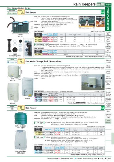 PRICESDISPLAYEDINCLUDE8%TAX.EG-27(CONNECTINGPIPE)EXAMPLE(EG-26)EXAMPLE*EG-26ISACOMBINEDTWOPIECESOFEG-24.EG-24225MM490MM740MMDEPTHWIDTHHEIGHT307321303606308502RWT-110-GREEN(110LTYPE)RWT-250-GREY(250LTYPE)EXAMPLEMITSUGIRONRAINKEEPERTAKIRONRAINWATERSTORAGETANK"AMAOTO-KUN"ORDERCODEITEMNO.PRICE(PERPIECE)MSRP(PERPIECE)COLORWXDXH(MM)WATERSTORAGEVOLUME(L)SPQ(PIECE)WEIGHT(KG)★470-4495307321¥28,350¥28,000BEIGE700X380X64512017★470-4509308502¥57,105¥56,400BEIGE781X420X1075150115★470-4487303606¥72,900¥72,000BEIGE736X498X1100200118CONTACTUS:03-5715-7701HTTP://WWW.TAKIRON.CO.JP/ORDERCODEITEMNO.PRICE(PERPIECE)MSRP(PERPIECE)DIAMETERXL(MM)SPQ(PIECE)WEIGHT(G)397-7331EG-27¥1,080¥1,50044X17420100CONTACTUS:072-257-7281HTTP://WWW.MITSUGIRON.CO.JP/ORDERCODEITEMNO.PRICE(PERPIECE)MSRP(PERPIECE)COLORWATERSTORAGEVOLUME(L)SPQ(PIECE)WEIGHT(KG)397-7307EG-24¥11,031¥14,000GREEN5014.0397-7293EG-01¥12,343¥15,000GREEN8014.5397-7323EG-26¥20,983¥26,000GREEN50X217.5KODAMARAINKEEPERORDERCODEITEMNO.PRICE(PERSET)MSRP(PERSET)COLORWXDXH(MM)WATERSTORAGEVOLUME(L)SPQ(SET)WEIGHT(KG/SET)★797-3586RWT-250-GREEN¥58,166-GREEN750X510X1170250122★797-3594RWT-250-GREY¥58,166-GRAY750X510X1170250122CONTACTUS:06-6341-0015HTTP://WWW.D-KJK.CO.JP/ORDERCODEITEMNO.PRICE(PERSET)MSRP(PERSET)COLORWXDXH(MM)WATERSTORAGEVOLUME(L)SPQ(SET)WEIGHT(KG/SET)797-3560RWT-110-GREEN¥17,434-GREEN650X400X60511015.8797-3578RWT-110-GREY¥17,434-GRAY650X400X60511015.8STOCK16ITEMSSTOCK64ITEMSSTOCK110ITEMSORDERUNIT:1SETKODAMAPLASTICSCO.LTDORDERUNIT:1SETFACTORYDIRECTNOFREIGHTCHARGEEXCLUDINGREMOTEISLANDSORDERUNIT:1PIECEMITSUGIRONCO.LTDORDERUNIT:1PIECEORDERUNIT:1PIECEFACTORYDIRECTNOFREIGHTCHARGEEXCLUDINGREMOTEISLANDSTAKIRONCO.,LTDFEATURES●CAPACITYCANBEINCREASEDBYCONNECTINGTANKS.●WHENITBECOMESFULL,ITWILLAUTOMATICALLYDRAINAGE.●WITHACOCKTHATCANDRAINAGEONLYTHENECESSARYAMOUNT.USE●STOREANDREUSERAINWATER.●FOREMERGENCYWATER,WATERINGOFFLOWERSANDSOON.MATERIALS●MAINBODY,HOSE,CAP:POLYETHYLENE(PE)●FILTER:URETHANE●BANDS:STEELORIGIN●JAPANFEATURES●YOUCANSTORERAINWATERFROMANARRANGEMENT.●THEATTACHEDACCESSORYWATERCOLLECTORCOUPLINGSHASADISHTHATDOESNOTALLOWFALLENLEAVESTOENTER,ANDITISASTRUCTURETHATMAKESITDIFFICULTFORINITIALRAINWATERTOENTER.INADDITION,ITCORRESPONDSTOTHEEACHMANUFACTURER.USE●WATERINGTOGARDENATHOME,WATERSTORAGEASDOMESTICWATERATEMERGENCY.MATERIALS●POLYETHYLENE(PE)ACCESSORIES●ONEWATERCATCHINGCOUPLINGX1,HOSE(70CM),HOSEBANDX2,FAUCETX1,SEALTAPEORIGIN●JAPANFEATURES●TANKANDTANKCANBECONNECTED.CONNECTINGPIPEFEATURES●CANBEEASILYCONSTRUCTED.●CLEANINGISEASYSINCEITALSOHASADRAINPORT.●SOMELOCALGOVERNMENTSHAVEASUBSIDYSYSTEMFORTHIS.USE●WATERINGOFPLANTS.●WATERSPRINKLINGINTHEGARDEN.●CARWASHING.●FOREMERGENCYDAILYLIFEWATER.●REDUCTIONINURBANTYPEFLOOD(GUERRILLARAINSTORM),ETC.MATERIALS●POLYETHYLENE(PE)SETCONTENTS●CONTAINERMAINBODY●WATERCOLLECTINGPARTSSET●COCK●BELLOWSHOSE●WIREBAND●WATERSTOPPINGCOCK●DEFORMEDCOUPLING110LTYPEFEATURES●EXCLUSIVEPARTSNECESSARYFORMOUNTINGARESET.●STABILIZESWITHTHEEXCLUSIVEFRAME.●WITHUPORTFITTINGFORFALLPREVENTION.SETCONTENTS●CONTAINERMAINBODY●WATERCOLLECTINGPARTSSET●COCK●PIPE●WIREBAND●WATERSTOPPINGCOCK●DEFORMEDCOUPLING250LTYPESPECS●CONNECTIONPIPEMATERIALS●CONNECTINGPIPE/CAP:POLYETHYLENE(PE)●FILTER:URETHANEORIGIN●JAPANHOSES・CONNECTORSHOSESFORSPRINKLINGHOSESFORFOODHOSESFORINDUSTRYHOSESFORDRAINAGEHOSECOUPLINGSSUCTIONHOSESHOSEBANDSHOSEREELSHOSENOZZLESEQUIPMENTSFORHOSESPRINKLERSSNOW-MELTINGHOSESAUTOMATICSPRINKLINGSYSTEMSSPRINKLINGTUBES,SPRINKLINGHOSESOUTDOORSINKSWATERINGCANS,JUGSRAINKEEPERSRAINKEEPERSSTOCK6ITEMS9-1341*0523980*9-1341DELIVERYESTIMATE★…MANUFACTURERSTOCK★…DELIVERYWITHIN7WORKINGDAYS★…ASK