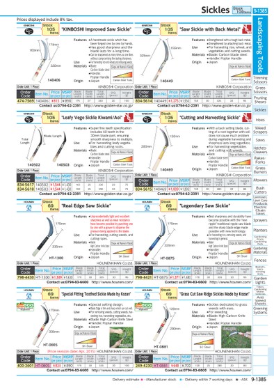 PRICESDISPLAYEDINCLUDE8%TAX.CARBONSTEELTOOLSSHAPEANDMATERIALOFBLADE140406160MM330MM175MM155MM325MM140449BLADELENGTHTOTALLENGTH140502140503CARBONSTEELTOOLSSHAPEANDMATERIALOFBLADECARBONSTEELTOOLSSHAPEANDMATERIALOFBLADECARBONSTEELTOOLSSHAPEANDMATERIALOFBLADE120MM280MM140469335MMHT-1300170MMSKSTEELSHAPEANDMATERIALOFBLADE335MMHT-0875170MMSKSTEELSHAPEANDMATERIALOFBLADE335MMHT-0805170MMSKSTEELSHAPEANDMATERIALOFBLADE280MMHT-0881120MMEXAMPLESCSTEELSHAPEANDMATERIALOFBLADEEXAMPLEKINBOSHI"KINBOSHIIMPROVEDSAWSICKLE"STOCK105ITEMSORDERUNIT:1PIECEKINBOSHICORPORATIONORDERCODEITEMNO.PRICE(PERPIECE)MSRP(PERPIECE)BLADELENGTH(MM)BLADEWIDTH(MM)TOTALLENGTH(MM)SPQ(PIECE)WEIGHT(G)474-7569140406¥813¥8901752733020100CONTACTUS:0794-62-2391HTTP://WWW.GOLDEN-STAR.CO.JP/KINBOSHI"LEAFYVEGESICKLEKIWAMI/AOI"STOCK105ITEMSORDERUNIT:1PIECEKINBOSHICORPORATIONORDERCODEITEMNO.PRICE(PERPIECE)MSRP(PERPIECE)BLADELENGTH(MM)BLADEWIDTH(MM)TOTALLENGTH(MM)SPQ(PIECE)WEIGHT(G)834-5617140502¥1,544¥1,430165253302075834-5618140503¥1,544¥1,430100252902073CONTACTUS:0794-62-2391HTTP://WWW.GOLDEN-STAR.CO.JP/HOUNEN"REALEDGESAWSICKLE"STOCK69ITEMSORDERUNIT:1PIECEHOUNENKIHANCO.LTD.ORDERCODEITEMNO.PRICE(PERPIECE)MSRP(PERPIECE)BLADELENGTH(MM)BLADEWIDTH(MM)TOTALLENGTH(MM)SPQ(PIECE)WEIGHT(G)798-4430HT-1300¥1,509¥1,630170303352095CONTACTUS:0794-83-6600HTTP://WWW.HOUNEN.COM/HOUNEN"SPECIALFITTINGTOOTHEDSICKLEMADEBYKOZAN"STOCK69ITEMSORDERUNIT:1PIECE(PRICEREVISIONDATE:APR,2015)HOUNENKIHANCO.LTD.ORDERCODEITEMNO.PRICE(PERPIECE)MSRP(PERPIECE)BLADELENGTH(MM)BLADEWIDTH(MM)TOTALLENGTH(MM)SPQ(PIECE)WEIGHT(G)400-2601HT-0805¥824¥8901703033520100CONTACTUS:0794-83-6600HTTP://WWW.HOUNEN.COM/FEATURES●AHANDMADESICKLEWHICHHASBEENFORGEDONEBYONEBYHANDS.●HASGOODSHARPNESSANDTHEBLADELASTSFORALONGTIME.●CANBESHARPENEDASMANYTIMESASONELIKESWITHOUTCOMPROMISINGTHELASTINGSHARPNESS.USE●FORHARVESTINGRICEANDWHEATANDREMOVINGWEEDS.MATERIALS●BLADE:CARBONBLADESTEEL●HANDLE:POPLARHANDLEORIGIN●JAPANFEATURES●SUPERFINETEETHSPECIFICATIONINCLUDES60TEETHINTHE30MMBLADEPART,ENSURINGSMOOTHSHARPNESSTOMULTIPLY.USE●FORHARVESTINGLEAFYVEGETA-BLESANDCUTTINGROOTS.MATERIALS●BLADE:CARBONBLADESTEEL●HANDLE:POPLARHANDLEORIGIN●JAPANFEATURES●UNPRECEDENTEDLYLIGHTANDEXCELLENTSHARPNESSASWELLASWEARRESISTANCEHAVEBECOMEPOSSIBLEBYPUNCHINGONEBYONEWITHAGRAVERTODISPERSETHEPRESSUREBEINGAPPLIEDTOTHEBLADE.USE●FORHARVESTING,CUTTINGWEEDS,ANDCUTTINGROPES.MATERIALS●BLADE:HIGHCARBONKNIFESTEEL●HANDLE:POPLARHANDLEORIGIN●JAPANCHEMICALCONTENTINSPECTION.COMECOFEATURES●SPECIALSETTINGDESIGN.●BLADEEDGEISTHINANDSHARPWHICHCANCUTWELL.USE●FORREMOVINGWEEDS,CUTTINGWEEDS,HAR-VESTINGRICE,HARVESTINGVEGETABLES,ETC.MATERIALS●BLADE:HIGHCARBONKNIFESTEEL●HANDLE:POPLARHANDLEORIGIN●JAPANKINBOSHI"SAWSICKLEWITHBACKMETAL"STOCK105ITEMSORDERUNIT:1PIECEKINBOSHICORPORATIONORDERCODEITEMNO.PRICE(PERPIECE)MSRP(PERPIECE)BLADELENGTH(MM)BLADEWIDTH(MM)TOTALLENGTH(MM)SPQ(PIECE)WEIGHT(G)834-5614140449¥1,275¥1,550155303252093CONTACTUS:0794-62-2391HTTP://WWW.GOLDEN-STAR.CO.JP/KINBOSHI"CUTTINGANDHARVESTINGSICKLE"STOCK105ITEMSORDERUNIT:1PIECEKINBOSHICORPORATIONORDERCODEITEMNO.PRICE(PERPIECE)MSRP(PERPIECE)BLADELENGTH(MM)BLADEWIDTH(MM)TOTALLENGTH(MM)SPQ(PIECE)WEIGHT(G)834-5615140469¥1,009¥1,095120302802088CONTACTUS:0794-62-2391HTTP://WWW.GOLDEN-STAR.CO.JP/HOUNEN"LEGENDARYSAWSICKLE"STOCK69ITEMSORDERUNIT:1PIECEHOUNENKIHANCO.LTD.ORDERCODEITEMNO.PRICE(PERPIECE)MSRP(PERPIECE)BLADELENGTH(MM)BLADEWIDTH(MM)TOTALLENGTH(MM)SPQ(PIECE)WEIGHT(G)798-4421HT-0875¥1,371¥1,480170303352095CONTACTUS:0794-83-6600HTTP://WWW.HOUNEN.COM/HOUNEN"GRASSCUTSAWRIDGESICKLESMADEBYKOZAN"STOCK69ITEMSORDERUNIT:1PIECEHOUNENKIHANCO.LTD.ORDERCODEITEMNO.PRICE(PERPIECE)MSRP(PERPIECE)BLADELENGTH(MM)BLADEWIDTH(MM)TOTALLENGTH(MM)SPQ(PIECE)WEIGHT(G)249-4230HT-0881¥648¥700120252802080CONTACTUS:0794-83-6600HTTP://WWW.HOUNEN.COM/FEATURES●STRENGTHENEDWITHATOUGHBACKMETAL.●STRENGTHENEDBYATTACHINGBACKMETAL.USE●FORHARVESTINGRICE,WHEAT,ANDVEGETABLESANDCUTTINGWEEDS.MATERIALS●BLADE:CARBONBLADESTEEL●HANDLE:POPLARHANDLEORIGIN●JAPANFEATURES●WITHABACKSETTINGBLADE,CUT-TINGOFAROOTTOGETHERWITHSOILDOESNOTCAUSEMUCHPROBLEMDURINGVEGETABLEHARVESTINGANDSHARPNESSLASTSLONGREGARDLESS.USE●FORHARVESTINGVEGETABLESANDCUTTINGSOFTWEEDS.MATERIALS●BLADE:CARBONBLADESTEEL●HANDLE:POPLARHANDLEORIGIN●JAPANFEATURES●BESTSHARPNESSANDDURABILITYHAVEBECOMEPOSSIBLEWITHTHE"NEWRIPPLE"TRADITIONALRIPPLESAWBLADEANDTHESHARPBLADEEDGEMADEPOSSIBLEWITHNEWTECHNOLOGY.USE●FORHARVESTINGRICE,REMOVINGWEEDS,ANDHARVESTINGINGENERAL.MATERIALS●BLADE:HIGHCARBONKNIFESTEEL●HANDLE:POPLARHANDLEORIGIN●JAPANCHEMICALCONTENTINSPECTION.COMECOFEATURES●SICKLESDEDICATEDTOGRASSWEEDSWITHEYES.USE●FORWEEDING.MATERIALS●BLADE:HIGHCARBONKNIFESTEEL●HANDLE:POPLARHANDLEORIGIN●JAPANLANDSCAPINGTOOLSTRIMMINGSCISSORSGRASSSCISSORSPRUNINGSHEARSSICKLESHOESWEEDSCRAPERSSAWSHATCHETS・CLEAVERSRAKES・FORKSGRASSBURNERSMOWERSBUSHCUTTERSLAWNMOWERS,LAWNCAREPRODUCTSELECTRICCHAINSAWSSPRAYERSPLANTERSGARDENINGPROPS,GARDENINGNETSGARDENINGMATERIALSFENCESBASKETS,STEM_WINDINGROLLSGARDENLIGHTSTILLERS,GARDENINGMOTORVEHICLESANTIWEEDSHEETSGREENINGSYSTEMSSICKLESSTOCK108ITEMS9-1385*0524341*9-1385DELIVERYESTIMATE★…MANUFACTURERSTOCK★…DELIVERYWITHIN7WORKINGDAYS★…ASK