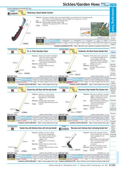 PRICESDISPLAYEDINCLUDE8%TAX.0705421050MM120MM245MM1050MM120MM300MM0767311050MM1050MM125MM220MM079844125MM220MM1050MM115MM254MM0706770798511060MM205MM113MM50274770094580MM235MMSTAINLESSBLADESTEELSHAPEANDMATERIALOFBLADEEXAMPLEDAISHIN"STAINLESSSTEELMULTISICKLE"STOCK29ITEMSORDERUNIT:1PIECEDAISHINCO.,LTD.ORDERCODEITEMNO.PRICE(PERPIECE)MSRP(PERPIECE)BLADELENGTH(MM)BLADEWIDTH(MM)TOTALLENGTH(MM)SPQ(PIECE)WEIGHT(G)818-4416700945¥1,311-805423512128CONTACTUS:0794-64-7770HTTP://DAI-SHIN.COM/CONTENTS/COMPANY/INDEX.HTMLTHEGOLDENELEPHANT"H.S.FLATGARDENHOE"ORDERCODEITEMNO.PRICE(PERPIECE)MSRP(PERPIECE)TOTALLENGTH(MM)TIPWIDTH(MM)HEIGHT(MM)SPQ(PIECE)WEIGHT(KG)780-7520070542¥2,073-1050120245101.2CONTACTUS:072-229-5221HTTP://WWW.ASAKA-IND.CO.JP/THEGOLDENELEPHANT"GARDENHOEWITHSTEELWITHNON-SLIPHANDLE"ORDERCODEITEMNO.PRICE(PERPIECE)MSRP(PERPIECE)TOTALLENGTH(MM)TIPWIDTH(MM)HEIGHT(MM)SPQ(PIECE)WEIGHT(KG)819-3358079844¥3,797-1050125220101.2CONTACTUS:072-229-5221HTTP://WWW.ASAKA-IND.CO.JP/THEGOLDENELEPHANT"GARDENHOEWITHSTAINLESSSTEELWITHANTI-SLIPHANDLE"ORDERCODEITEMNO.PRICE(PERPIECE)MSRP(PERPIECE)TOTALLENGTH(MM)TIPWIDTH(MM)HEIGHT(MM)SPQ(PIECE)WEIGHT(KG)819-3359079851¥4,947-1050125220101.1CONTACTUS:072-229-5221HTTP://WWW.ASAKA-IND.CO.JP/STOCK83ITEMSSTOCK83ITEMSORDERUNIT:1PIECEASAKAINDUSTRIALCO.LTD.ORDERUNIT:1PIECEASAKAINDUSTRIALCO.LTD.ORDERUNIT:1PIECEASAKAINDUSTRIALCO.LTD.FEATURES●2TYPESOFBLADES,FLATANDSERRATEDBLADES,AREOPTIMUMFORREMOVINGWEEDS.●THEEASYTOHOLDSHAPEGRIPREDUCESFATIGUEFROMLONGHOURSOFWORK.USE●FORREMOVINGWEEDSANDCUTTINGROPES.MATERIALS●BLADEEDGE:STAINLESSBLADESTEEL●HANDLE:POLYPROPYLENE(PP)+TPRRESINORIGIN●TAIWANFEATURES●HEADANDHANDLEINSTALLATIONPARTSAREDRIVE-INTYPETHATDOESNOTNEEDWEDGES.USE●MOUNDLAYERING,COVERINGROOTSANDSOILPREPARATION.MATERIALS●HEAD:STEEL●HANDLE:NATURALWOODORIGIN●JAPANFEATURES●MAKESSOCLEAR-CUTTING.●ANANTI-SLIPSHAPEDGRIP.USE●EARTHINGUP,FURROWINGINFIELDS.MATERIALS●HEAD:STEEL,BLADESTEEL●HANDLE:NATURALBEECHWOODORIGIN●JAPANFEATURES●MAKESSOCLEAR-CUTTING.●ANANTI-SLIPSHAPEDGRIP.●THEHEADISMADEOFSTAIN-LESSSTEELANDRESISTANTAGAINSTRUST.USE●EARTHINGUP,FURROWINGINFIELDS.MATERIALS●HEAD:STAINLESSSTEEL,STEEL,BLADESTEEL●HANDLE:NATURALBEECHWOODORIGIN●JAPANTHEGOLDENELEPHANT"AUTHENTICALLSTEELHOMEGARDENHOE"ORDERCODEITEMNO.PRICE(PERPIECE)MSRP(PERPIECE)TOTALLENGTH(MM)TIPWIDTH(MM)HEIGHT(MM)SPQ(PIECE)WEIGHT(KG)780-7660076731¥2,602-1050120300101.6CONTACTUS:072-229-5221HTTP://WWW.ASAKA-IND.CO.JP/THEGOLDENELEPHANT"ALUMINUMPIPEHANDLEFLATGARDENHOE"ORDERCODEITEMNO.PRICE(PERPIECE)MSRP(PERPIECE)TOTALLENGTH(MM)TIPWIDTH(MM)HEIGHT(MM)SPQ(PIECE)WEIGHT(KG)780-7538070677¥1,631-1050115254100.82CONTACTUS:072-229-5221HTTP://WWW.ASAKA-IND.CO.JP/DAISHIN"RAKURAKU-MARKSTAINLESSSTEELCULTIVATINGGARDENHOE"ORDERCODEITEMNO.PRICE(PERPIECE)MSRP(PERPIECE)TOTALLENGTH(MM)TIPWIDTH(MM)HEIGHT(MM)SPQ(PIECE)WEIGHT(KG)818-4420502747¥2,839-106011320531.15CONTACTUS:0794-64-7770HTTP://DAI-SHIN.COM/CONTENTS/COMPANY/INDEX.HTMLSTOCK83ITEMSSTOCK83ITEMSORDERUNIT:1PIECEDAISHINCO.,LTD.ORDERUNIT:1PIECEASAKAINDUSTRIALCO.LTD.ORDERUNIT:1PIECEASAKAINDUSTRIALCO.LTD.FEATURES●THEHEADPARTISQUENCHEDTOINCREASESTRENGTHANDISSTRONGAGAINSTWEARING.●SINCETEMPERINGISAPPLIED,ELASTICITYISALSOIMPROVED.USE●HILLING,SOILWORK.MATERIALS●HEAD:STEEL●HANDLE:NATURALWOODORIGIN●JAPANFEATURES●ALUMINUMHANDLEISSTRONGERAGAINSTWATERANDSOILANDLIGHTERCOMPAREDTOWOODANDSTEELPIPEHANDLES.USE●MOUNDLAYERING,EARTHINGUPANDREMOVINGWEEDSONSLANTEDMOUNDLAYER.MATERIALS●HEAD:STEEL●HANDLE:ALUMINUMORIGIN●CHINAFEATURES●SINCETHEPATENTEDHANDLEANDTHEHEADPARTAREBEINGFIXED,WEDGESARENOTREQUIRED.●WEREALIZED20%LIGHTWEIGHTTHANOURWOODHANDLEPAT-TERNCOMPAREDTOOURCOMPANY.USE●FORTHECULTIVATIONOFSOIL.MATERIALS●HEADPART:STAINLESSSTEEL●HANDLE:ALUMINUMORIGIN●CHINALANDSCAPINGTOOLSTRIMMINGSCISSORSGRASSSCISSORSPRUNINGSHEARSSICKLESHOESWEEDSCRAPERSSAWSHATCHETS・CLEAVERSRAKES・FORKSGRASSBURNERSMOWERSBUSHCUTTERSLAWNMOWERS,LAWNCAREPRODUCTSELECTRICCHAINSAWSSPRAYERSPLANTERSGARDENINGPROPS,GARDENINGNETSGARDENINGMATERIALSFENCESBASKETS,STEM_WINDINGROLLSGARDENLIGHTSTILLERS,GARDENINGMOTORVEHICLESANTIWEEDSHEETSGREENINGSYSTEMSSICKLES/GARDENHOESSTOCK15ITEMS9-1391*0524390*9-1391DELIVERYESTIMATE★…MANUFACTURERSTOCK★…DELIVERYWITHIN7WORKINGDAYS★…ASK