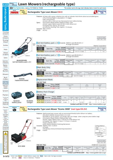 THENUMBERNEXTTOTHELOGOMARKINDICATESITEMSINSTOCKFOREACHBRAND.BL3622A(BATTERYPACK)DC36WA(CHARGER)1490MM460MMMLM430DWBX(SETITEM(BATTERYPACKX2))1020MMA53540(REPLACEMENTBLADE)LXWXH(MM)1490X460X1020ECO-3000450MM1400MM800MMLXWXH(MM)1400X450X800REELTYPECUTTINGMETHODFIXEDBLADEREELROTARYBLADEFORHERBICIDES,SEEP.9-1526TO1528MAKITARECHARGEABLETYPELAWNMOWER(36V)REPAIRINGOKSTOCK490ITEMSORDERUNIT:1PIECEORDERCODEITEMNO.PRICE(PERPIECE)MSRP(PERPIECE)TYPEVOLTAGE(V)CAPACITY(AH)POWER(V)ELECTRICITYCONSUMPTION(VA)SPQ(PIECE)WEIGHT(KG)419-1315BL3622A¥27,000¥25,000BATTERYPACK362.2--11.3419-1323DC36WA¥11,880¥11,000CHARGER--AC10023010.8CONTACTUS:0120-17-1197HTTP://WWW.MAKITA.CO.JP/ORDERUNIT:1PIECEMAKITACORPORATIONORDERCODEITEMNO.PRICE(PERPIECE)MSRP(PERPIECE)CUTTINGWIDTH(MM)CUTTINGHEIGHT(MM)NUMBEROFBLADES(SHEET)SPQ(PIECE)WEIGHT(KG)858-9906MLM430DWBX¥95,256¥88,20043020TO7513STAGES1119.3KINBOSHIRECHARGEABLETYPELAWNMOWER"ECOMO3000"(REELTYPE/25.2V)REPAIRINGOKORDERCODEITEMNO.PRICE(PERPIECE)MSRP(PERPIECE)CUTTINGWIDTH(MM)CUTTINGHEIGHT(MM)NUMBEROFBLADES(SHEET)SPQ(PIECE)WEIGHT(KG)423-9911ECO-3000¥244,350-3005TO305124.5CONTACTUS:0794-62-2391HTTP://WWW.GOLDEN-STAR.CO.JP/STOCK105ITEMSORDERUNIT:1PIECEKINBOSHICORPORATIONORDERUNIT:1PIECEORDERCODEITEMNO.PRICE(PERPIECE)MSRP(PERPIECE)CUTTINGWIDTH(MM)CUTTINGHEIGHT(MM)NUMBEROFBLADES(SHEET)SPQ(PIECE)WEIGHT(KG)858-9905MLM430DWB¥73,224¥67,80043020TO7513STAGES1118ORDERUNIT:1PIECEORDERCODEITEMNO.PRICE(PERPIECE)MSRP(PERPIECE)CUTTINGWIDTH(MM)CUTTINGHEIGHT(MM)NUMBEROFBLADES(SHEET)SPQ(PIECE)WEIGHT(KG)858-9907MLM430DZ¥52,704¥48,80043020TO7513STAGES1115.7ORDERUNIT:1SHEETORDERCODEITEMNO.PRICE(PERSHEET)MSRP(PERSHEET)CUTTINGWIDTH(MM)SPQ(SHEET)WEIGHT(KG)859-0126A53540¥1,836¥1,70043010.5FEATURES●COMESWITHAGRASSCOLLECTIONBOXWITHANINDICATORTHATINFORMSABOUTACCUMULATEDGRASS.●THETRIMMINGHEIGHTISADJUSTABLEIN13STAGES.●36VANDPOWERFUL.●COMESWITHACHILDLOCKKEYTHATPREVENTSFROMMALFUNCTIONING.SPECS●FLUCTUATIONBLADEROTATIONMETHOD:ROTARYTYPE●POWERSUPPLY:BATTERYPACK(DC36V/2.2AHLITHIUMION)●CHARGINGTIME:APPROX.60MINUTES●CONTINUOUSWORKINGTIME:APPROX.15MINUTESACCESSORIES●BOXWRENCHORIGIN●CHINAACCESSORIES●BATTERYPACK(BL3622A)X2●CHARGER(DC36WA)SETITEM(BATTERYPACKX2)ACCESSORIES●BATTERYPACK(BL3622A)X1●CHARGER(DC36WA)SETITEM(BATTERYPACKX1)MAINBODYONLYREPLACEMENTBLADEBATTERYPACK/CHARGERFEATURES●SELF-MOVINGLAWNMOWERWITHANENVIRONMENT-FRIENDLYBUILT-INLITHIUMIONBATTERY.●EXCELLENTUSABILITYBECAUSETHEREISNOCORD.●POSSIBLETOUSEFORAPPROX.30MINUTESWITHONECHARGE.(WHENUSINGTWOPIECEBATTERYBAG)SPECS●FLUCTUATIONBLADEROTATIONMETHOD:REELTYPE●POWERSUPPLY:BATTERYPACKX2(DC25.2V/3.0AHLITHIUMION)●CHARGINGTIME:APPROX.3HOURS(1.5HOURSX2PIECES)●GRAINCAPACITY:28.7L●WITHREVERSEROTATIONPOLISHINGMECHANISMACCESSORIES●BATTERYPACK(2PIECE)●CHARGER●WRAPPINGCOMPOUND(SHARPENINGPREPARATION)ORIGIN●JAPANLANDSCAPINGTOOLSTRIMMINGSCISSORSGRASSSCISSORSPRUNINGSHEARSSICKLESHOESWEEDSCRAPERSSAWSHATCHETS・CLEAVERSRAKES・FORKSGRASSBURNERSMOWERSBUSHCUTTERSLAWNMOWERS,LAWNCAREPRODUCTSELECTRICCHAINSAWSSPRAYERSPLANTERSGARDENINGPROPS,GARDENINGNETSGARDENINGMATERIALSFENCESBASKETS,STEM_WINDINGROLLSGARDENLIGHTSTILLERS,GARDENINGMOTORVEHICLESANTIWEEDSHEETSGREENINGSYSTEMSSTOCK35ITEMSLAWNMOWERS(RECHARGEABLETYPE)9-1470*N098625*PLEASEWEARPROTECTIVEEQUIPMENTTOUSESAFELY.9-1470ORDERCODEYELLOW…INSTANTDELIVERY(JAPANONLY)BLUE…BACKORDER(CARRIAGEEXCLUDED)ITEMNO.PINK…STOCKININDONESIA/THAILAND