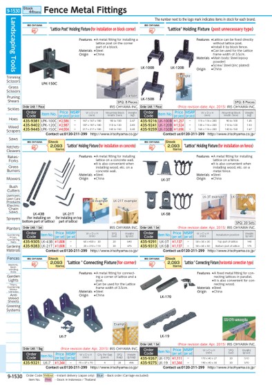 THENUMBERNEXTTOTHELOGOMARKINDICATESITEMSINSTOCKFOREACHBRAND.LPK-150CEXAMPLEEXAMPLELK-150BLK-100BLK-120BLK-43BEXAMPLELK-21T(FORINSTALLINGONTOPPARTOFLATTICE)LK-5BEXAMPLELK-3TEXAMPLELK-3TLK-5BLK-7EXAMPLELK-19LK-170LK-170EXAMPLELK-43B(FORINSTALLINGONBOTTOMPARTOFLATTICE)LK-21TEXAMPLEIRISOHYAMA"LATTICEPOST"HOLDINGFIXTURE(FORINSTALLATIONONBLOCKCORNER)ORDERCODEITEMNO.PRICE(PERPIECE)MSRP(PERPIECE)WXDXH(MM)MOUNTINGBLOCKWIDTH(MM)WEIGHT(KG)435-9381LPK-100C¥2,586-167X167X18090TO1002.47435-9402LPK-120C¥2,987-187X187X180110TO1202.83435-9445LPK-150C¥4,004-217X217X180140TO1503.40CONTACTUS:0120-211-299HTTP://WWW.IRISOHYAMA.CO.JP/SPQ:8PIECESORDERUNIT:1PIECEIRISOHYAMAINC.IRISOHYAMA"LATTICE"HOLDINGFIXTURE(FORINSTALLATIONONCONCRETE)STOCK2,093ITEMSORDERCODEITEMNO.PRICE(PERSET)MSRP(PERSET)WXDXH(MM)SPQ(SET)WEIGHT(G/SET)435-9305LK-43B¥1,808-60X430X3020640435-9283LK-21T¥1,808-20X210X11020475CONTACTUS:0120-211-299HTTP://WWW.IRISOHYAMA.CO.JP/ORDERUNIT:1SETIRISOHYAMAINC.IRISOHYAMA"LATTICE"CONNECTINGFIXTURE(FORCORNER)ORDERCODEITEMNO.PRICE(PERBAG)MSRP(PERBAG)WXDXH(MM)Q'TYPERBAG(PIECE)SPQ(BAG)WEIGHT(G/BAG)435-9321LK-7¥1,344-70X37X70420495CONTACTUS:0120-211-299HTTP://WWW.IRISOHYAMA.CO.JP/STOCK2,093ITEMSORDERUNIT:1BAG(PRICEREVISIONDATE:APR,2015)IRISOHYAMAINC.FEATURES●AMETALFITTINGFORINSTALLINGALATTICEPOSTONTHECORNERPARTOFABLOCK.MATERIALS●STEELORIGIN●CHINAFEATURES●AMETALFITTINGFORINSTALLINGLATTICEONACONCRETEWALL.●ITISALSOCONVENIENTWHENINSTALLINGWOOD,ETC.ONACONCRETEWALL.MATERIALS●STEELORIGIN●CHINAFEATURES●AMETALFITTINGFORCONNECT-INGACORNEROFLATTICEANDAPOST.●CANBEUSEDFORTHELATTICEFRAMEWIDTHOF3.5CM.MATERIALS●STEELORIGIN●CHINAIRISOHYAMA"LATTICE"HOLDINGFIXTURE(POSTUNNECESSARYTYPE)ORDERCODEITEMNO.PRICE(PERPIECE)MSRP(PERPIECE)WXDXH(MM)MOUNTINGBLOCKWIDTH(MM)WEIGHT(KG)435-9216LK-100B¥1,257-115X116X20090TO1001.45435-9241LK-120B¥1,524-135X116X200110TO1201.53435-9259LK-150B¥1,696-165X116X200140TO1501.67CONTACTUS:0120-211-299HTTP://WWW.IRISOHYAMA.CO.JP/SPQ:8PIECESORDERUNIT:1PIECE(PRICEREVISIONDATE:APR,2015)IRISOHYAMAINC.IRISOHYAMA"LATTICE"HOLDINGFIXTURE(FORINSTALLATIONONFENCE)ORDERCODEITEMNO.PRICE(PERSET)MSRP(PERSET)WXDXH(MM)INSTALLATIONPOSITIONWEIGHT(G/SET)435-9291LK-3T¥1,137-50X50X30TOPPARTOFLATTICE140435-9313LK-5B¥1,137-50X60X50BOTTOMPARTOFLATTICE175CONTACTUS:0120-211-299HTTP://WWW.IRISOHYAMA.CO.JP/STOCK2,093ITEMSSPQ:20SETSORDERUNIT:1SET(PRICEREVISIONDATE:APR,2015)IRISOHYAMAINC.IRISOHYAMA"LATTICE"CONNECTINGFIXTURE(HORIZONTALCONNECTIONTYPE)ORDERCODEITEMNO.PRICE(PERSET)MSRP(PERSET)WXDXH(MM)SPQ(SET)WEIGHT(G/SET)435-9267LK-170¥1,111-170X40X2720510435-9275LK-19¥1,344-190X40X3020570CONTACTUS:0120-211-299HTTP://WWW.IRISOHYAMA.CO.JP/STOCK2,093ITEMSORDERUNIT:1SET(PRICEREVISIONDATE:APR,2015)IRISOHYAMAINC.FEATURES●LATTICECANBEFIXEDDIRECTLYWITHOUTLATTICEPOST.●INSTALLITBYBLOCKFENCE.●CANBEUSEDFORTHELATTICEFRAMEWIDTHOF3.5CM.MATERIALS●MAINBODY:STEEL(EPOXYPOWDER)●SCREW:STEEL(ZINCPLATED)ORIGIN●CHINAFEATURES●AMETALFITTINGFORINSTALLINGLATTICEONAFENCE.●ITISALSOCONVENIENTWHENINSTALLINGWOOD,ETC.ONAMETALFENCE.MATERIALS●STEELORIGIN●CHINAFEATURES●AFIXEDMETALFITTINGFORCON-NECTINGLATTICESINPARALLEL.●ITISALSOCONVENIENTFORCON-NECTINGWOOD.MATERIALS●STEELORIGIN●CHINALANDSCAPINGTOOLSTRIMMINGSCISSORSGRASSSCISSORSPRUNINGSHEARSSICKLESHOESWEEDSCRAPERSSAWSHATCHETS・CLEAVERSRAKES・FORKSGRASSBURNERSMOWERSBUSHCUTTERSLAWNMOWERS,LAWNCAREPRODUCTSELECTRICCHAINSAWSSPRAYERSPLANTERSGARDENINGPROPS,GARDENINGNETSGARDENINGMATERIALSFENCESBASKETS,STEM_WINDINGROLLSGARDENLIGHTSTILLERS,GARDENINGMOTORVEHICLESANTIWEEDSHEETSGREENINGSYSTEMSSTOCK44ITEMSFENCEMETALFITTINGS9-1530*0525300*9-1530ORDERCODEYELLOW…INSTANTDELIVERY(JAPANONLY)BLUE…BACKORDER(CARRIAGEEXCLUDED)ITEMNO.PINK…STOCKININDONESIA/THAILAND